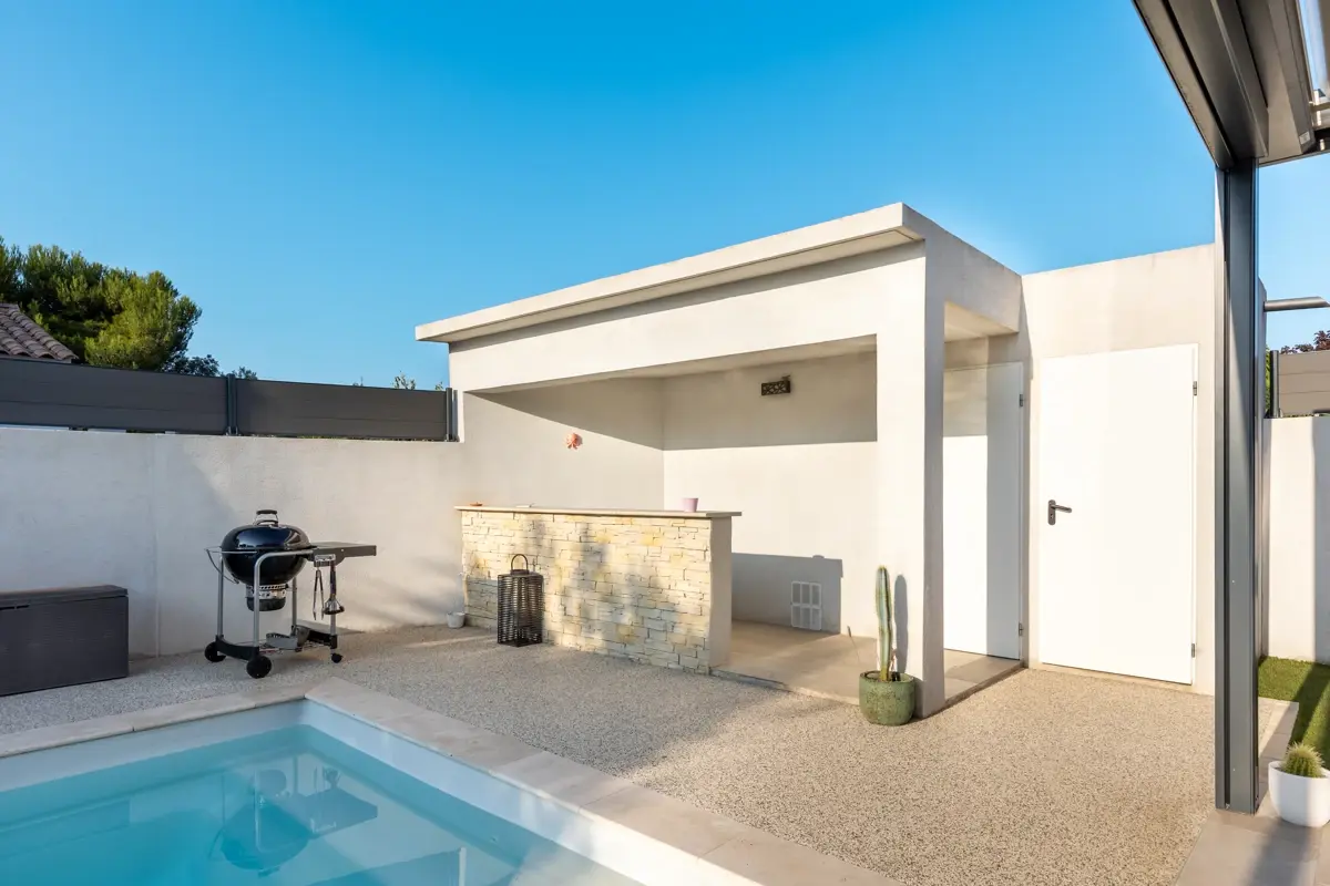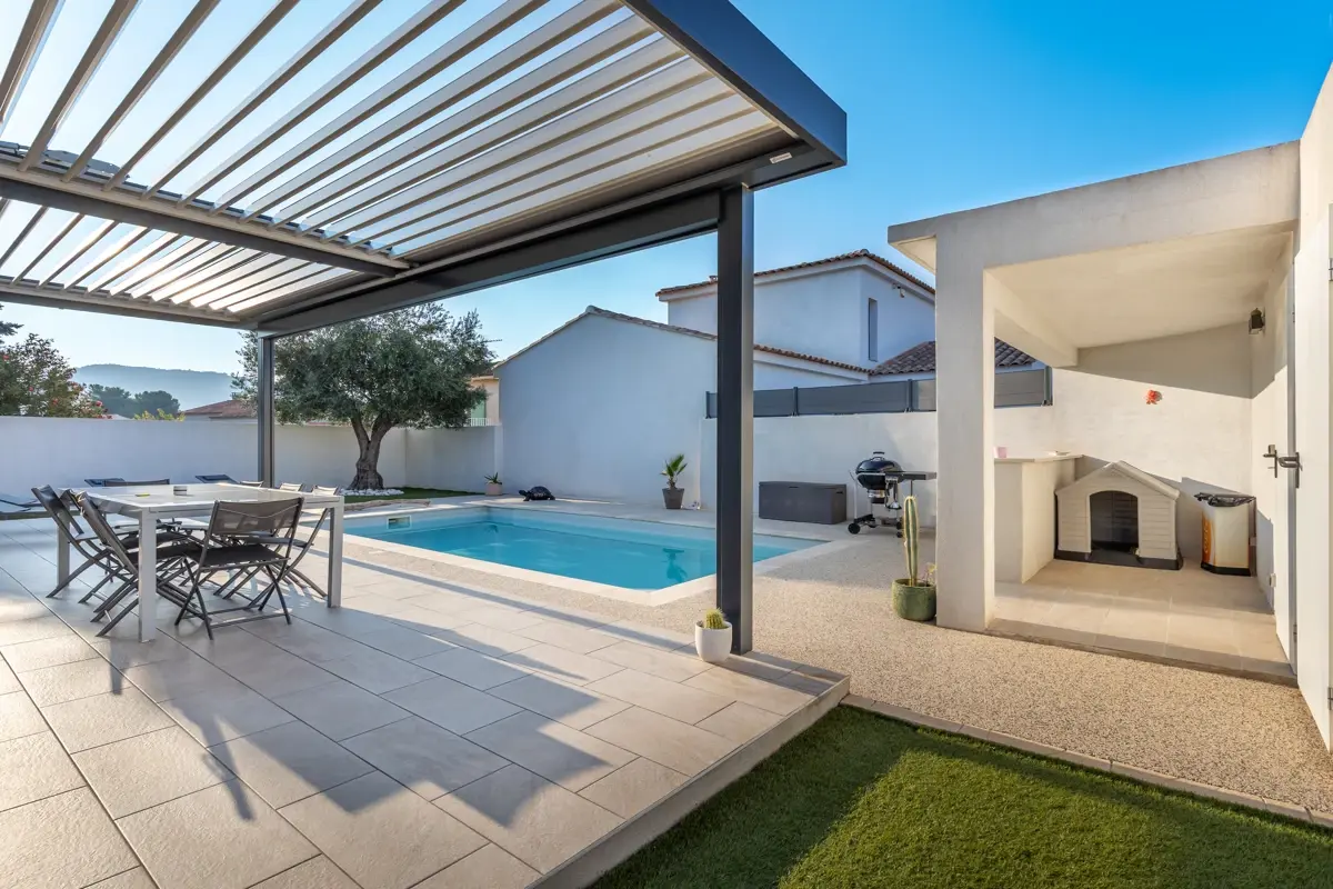 Profitez d'un espace extérieur isolé des regards, incluant une terrasse de 36 m² couverte par une pergola bioclimatique, une piscine au sel, un terrain de boules et un pool house avec WC extérieur.
