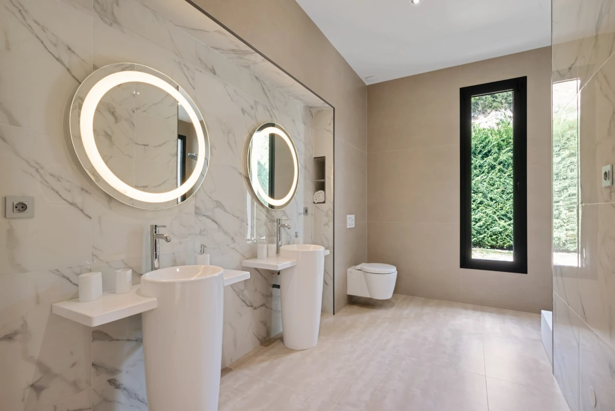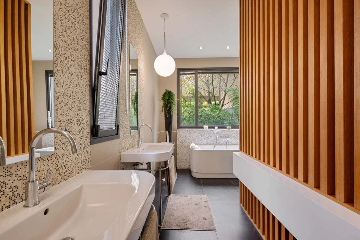 Dès l'entrée, découvrez un vaste salon lumineux avec cheminée et espace home cinéma, ouvrant sur une salle à manger élégante. La cuisine séparée est équipée d'appareils haut de gamme Gaggenau. La villa offre une surface habitable spacieuse, complétée par un chauffage par le sol et une climatisation gainée pour un confort optimal.