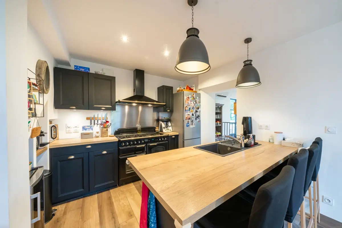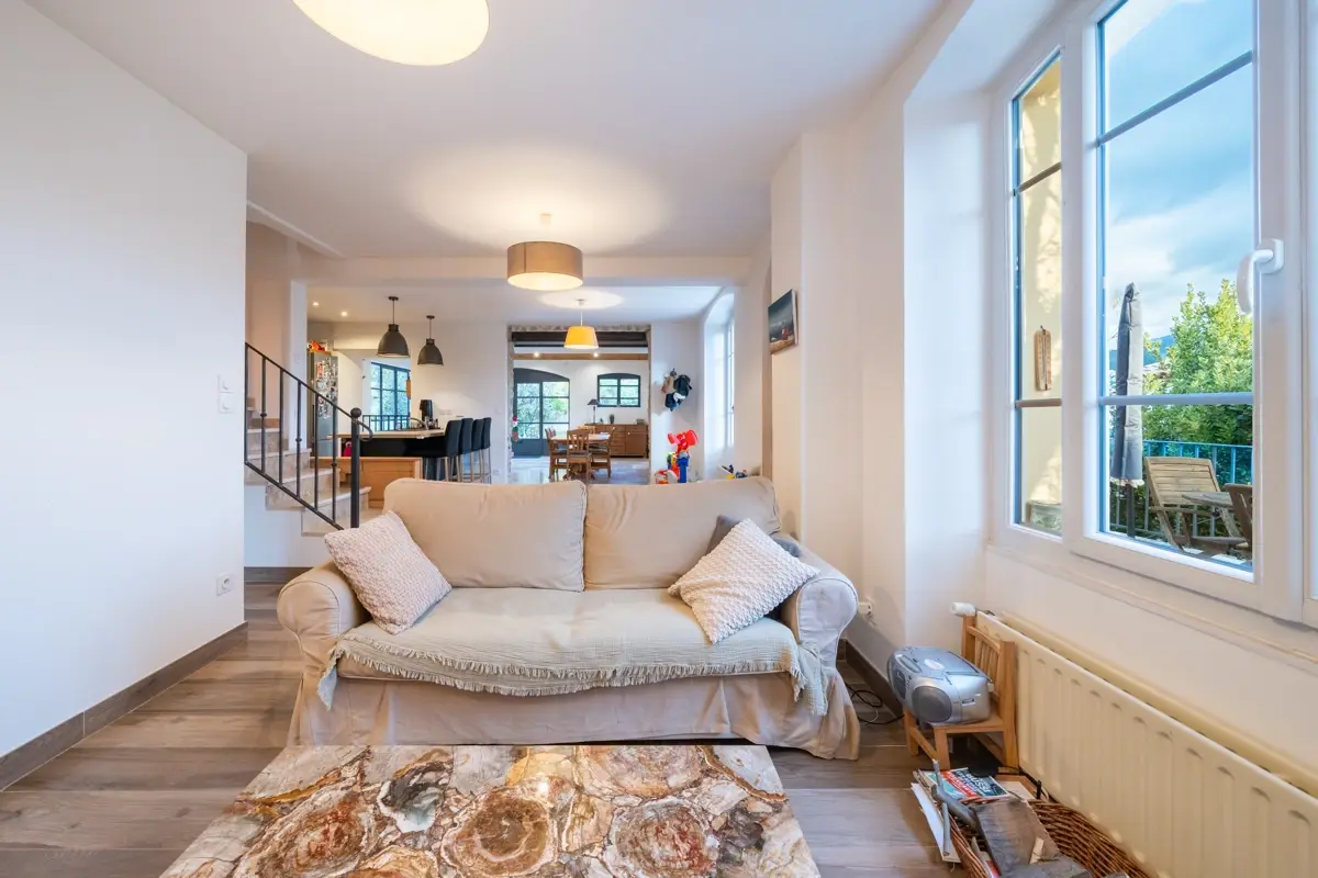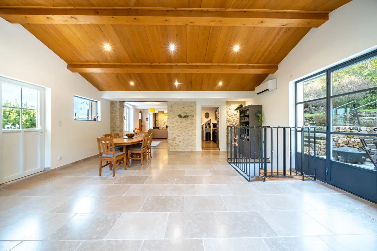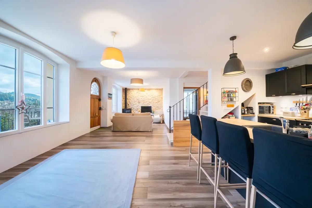 🛋️ Rez-de-chaussée : une grande pièce de vie de 70 m² environ, traversante et lumineuse, orientée plein sud, s’ouvre sur une cuisine moderne entièrement équipée. Vous profiterez également d’une première chambre, d’une buanderie fonctionnelle, d'une salle d’eau et de W.C séparés. L’ensemble met en valeur des matériaux nobles et des prestations soignées. Le système de chauffage, combinant climatisation réversible et poêle à bois, assure un confort appréciable toute l’année.