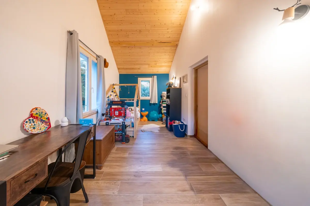 🛏️ Premier étage : il offre deux autres chambres. Une première ayant un accès privatif à une terrasse avec vue imprenable sur les collines, et une deuxième mansardée, pour un coin cosy. Une dernière pièce mansardée peut faire office de quatrième chambre ou de bureau. Enfin, une salle d'eau vient compléter cet étage.