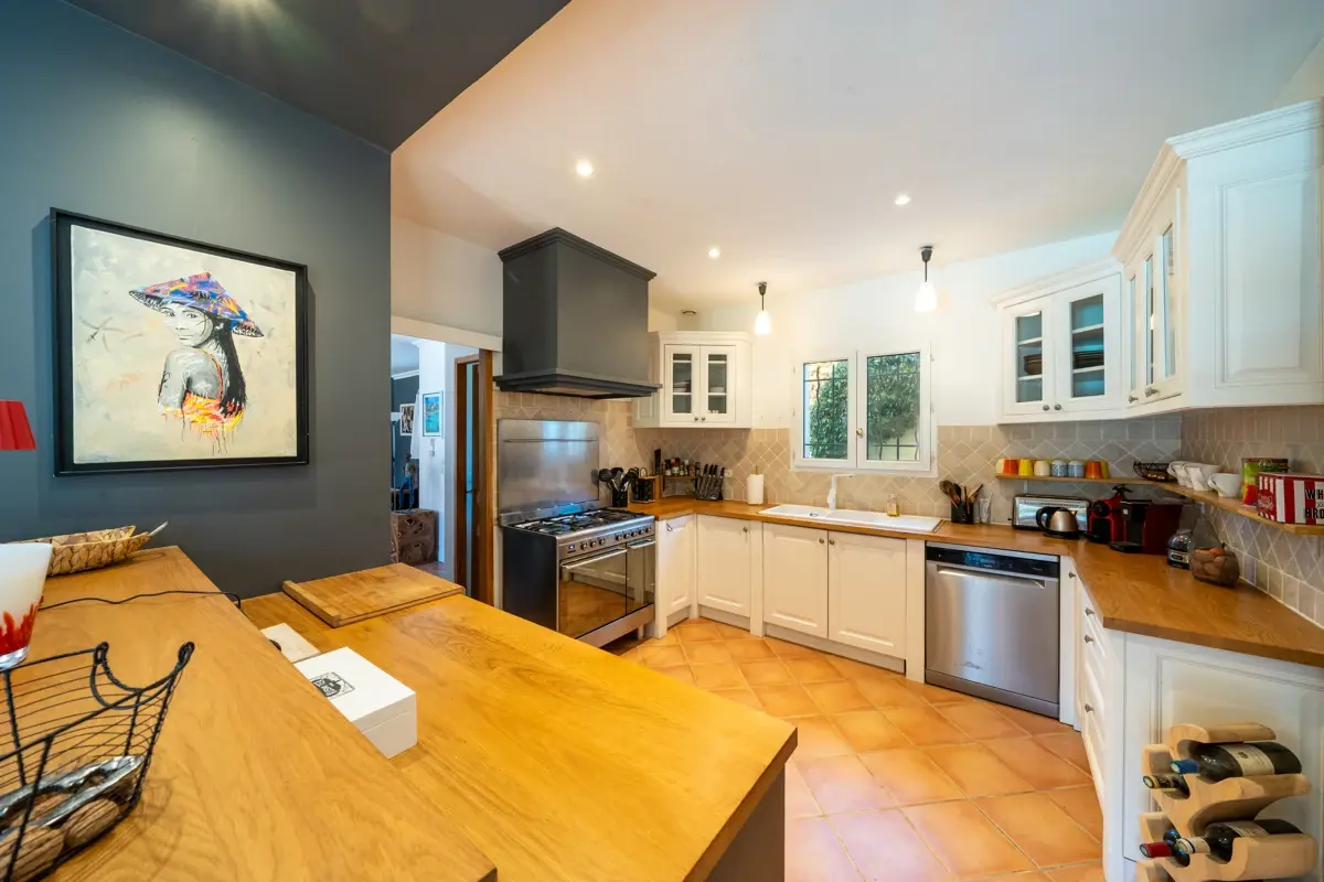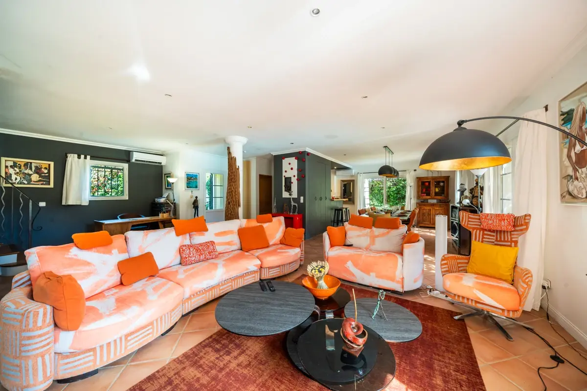 Le rez-de-chaussée s’articule autour d’un vaste espace de vie climatisé d’environ 80 m² comprenant salon, salle à manger et cuisine ouverte, baigné de lumière et ouvert sur la terrasse plein sud et le jardin paysager sans vis-à -vis. La cuisine, entièrement équipée, est complétée par une arrière-cuisine, une cave et des toilettes invités.