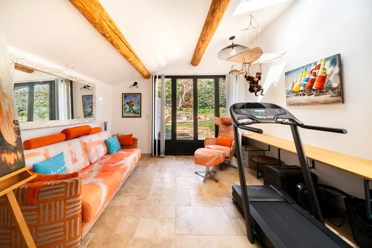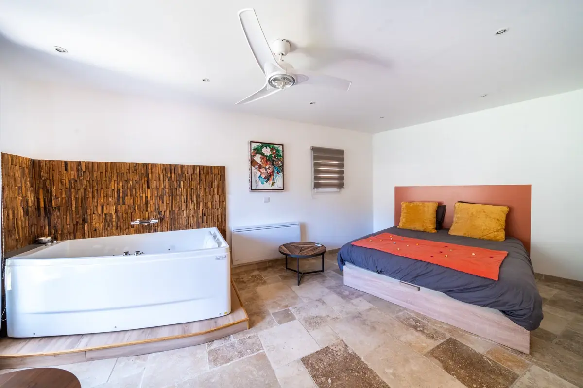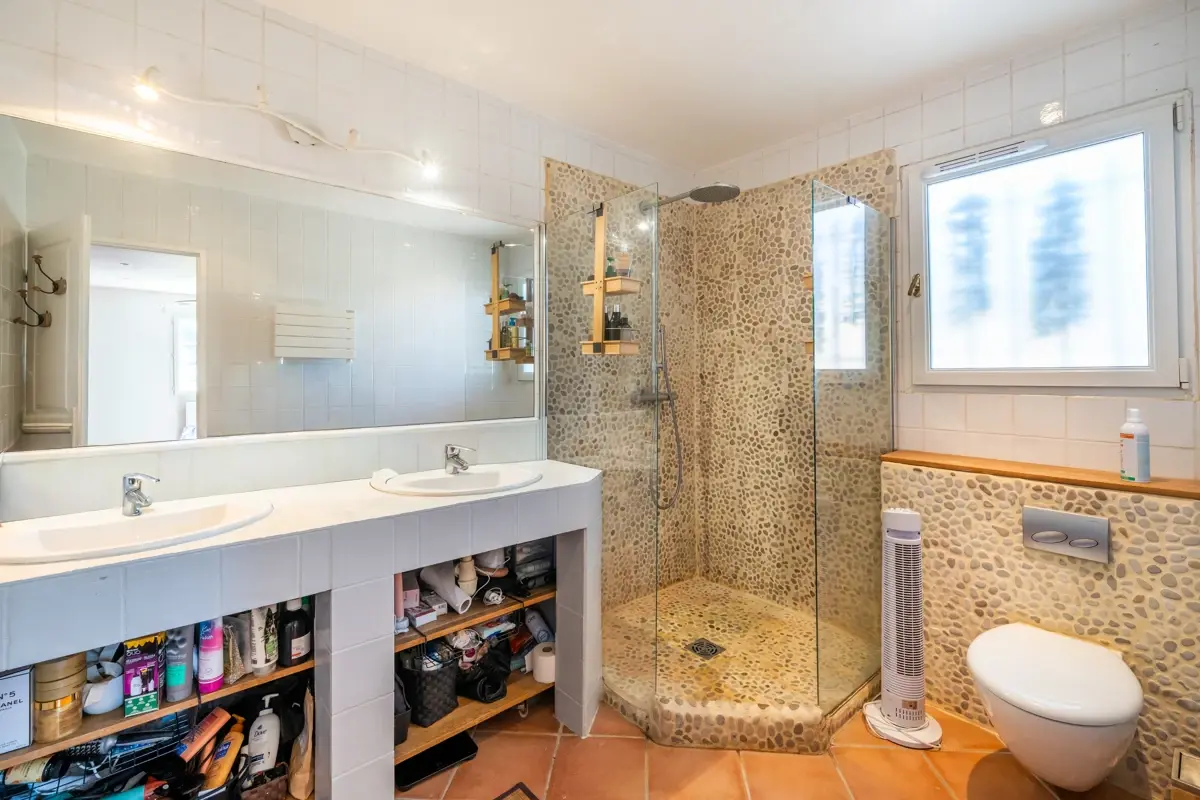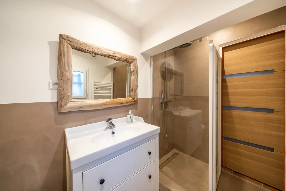 Ce niveau accueille également une suite indépendante de 23 m² avec salle d’eau, WC et baignoire balnéothérapie, ouvrant sur un jardinet privatif. Cet espace offre une grande polyvalence (invités, espace autonome ou potentiel locatif).