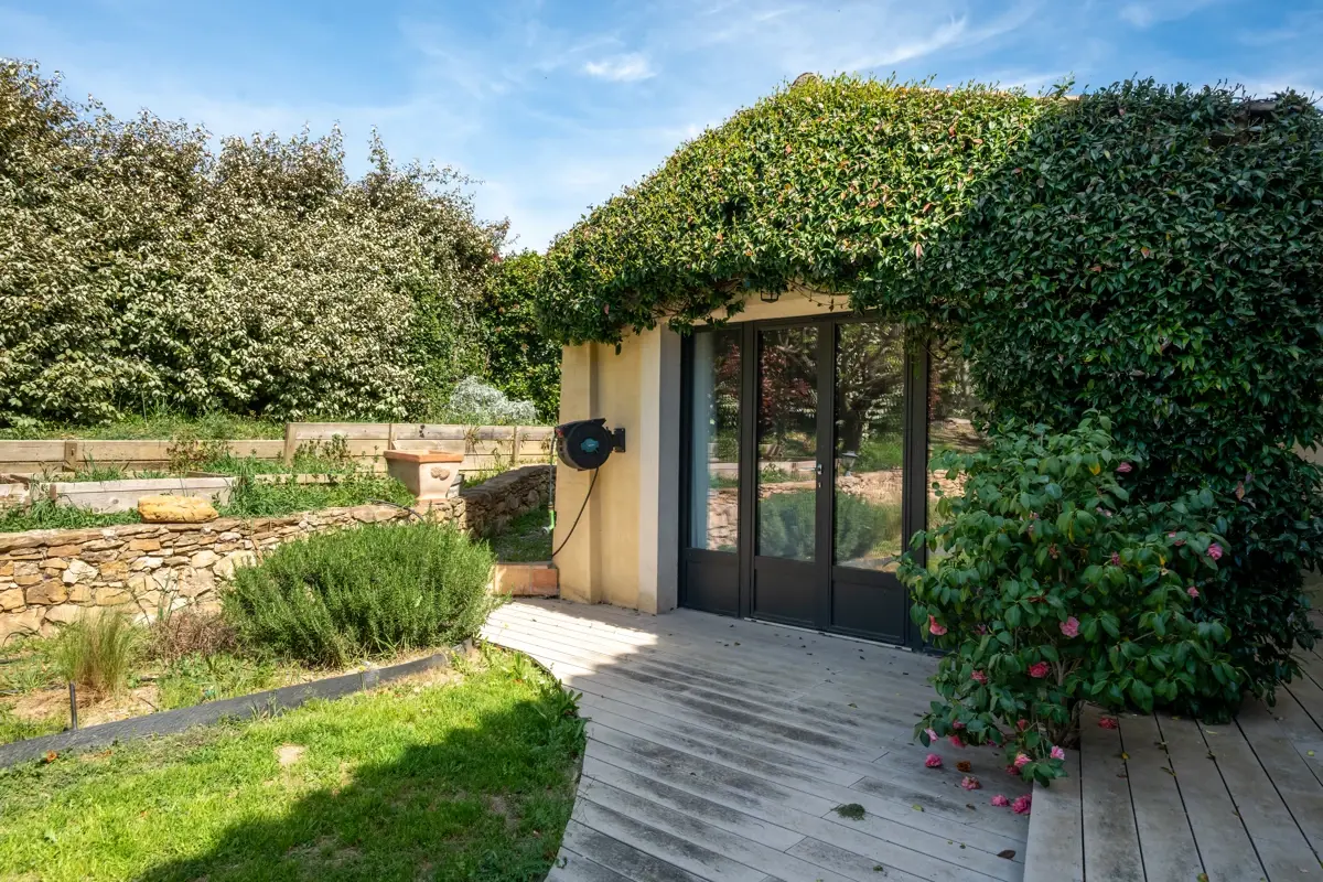 La terrasse plein sud prolonge harmonieusement les espaces de vie. La piscine chauffée de 10 x 5 m, récemment rénovée et sécurisée par un volet roulant électrique, constitue un véritable espace de détente. Le jardin accueille également un potager et un abri.