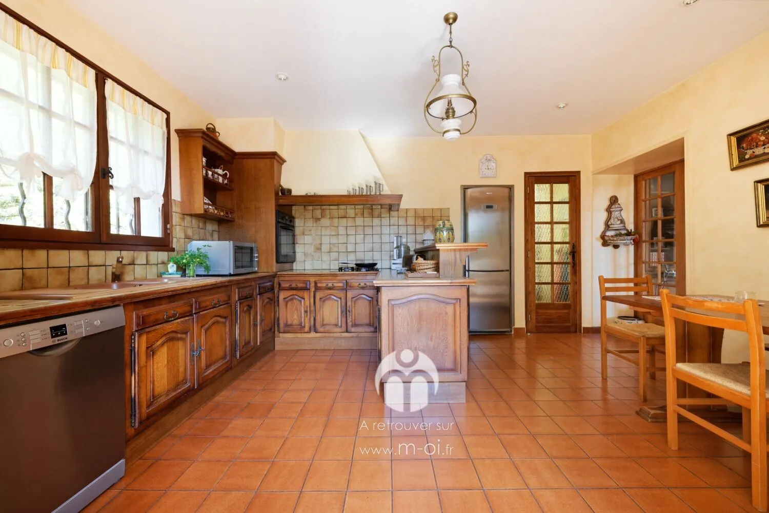 une cuisine équipée séparée de 18m2 avec son cellier, ouvrant sur la terrasse exposée sud et le joli jardin (piscinable)