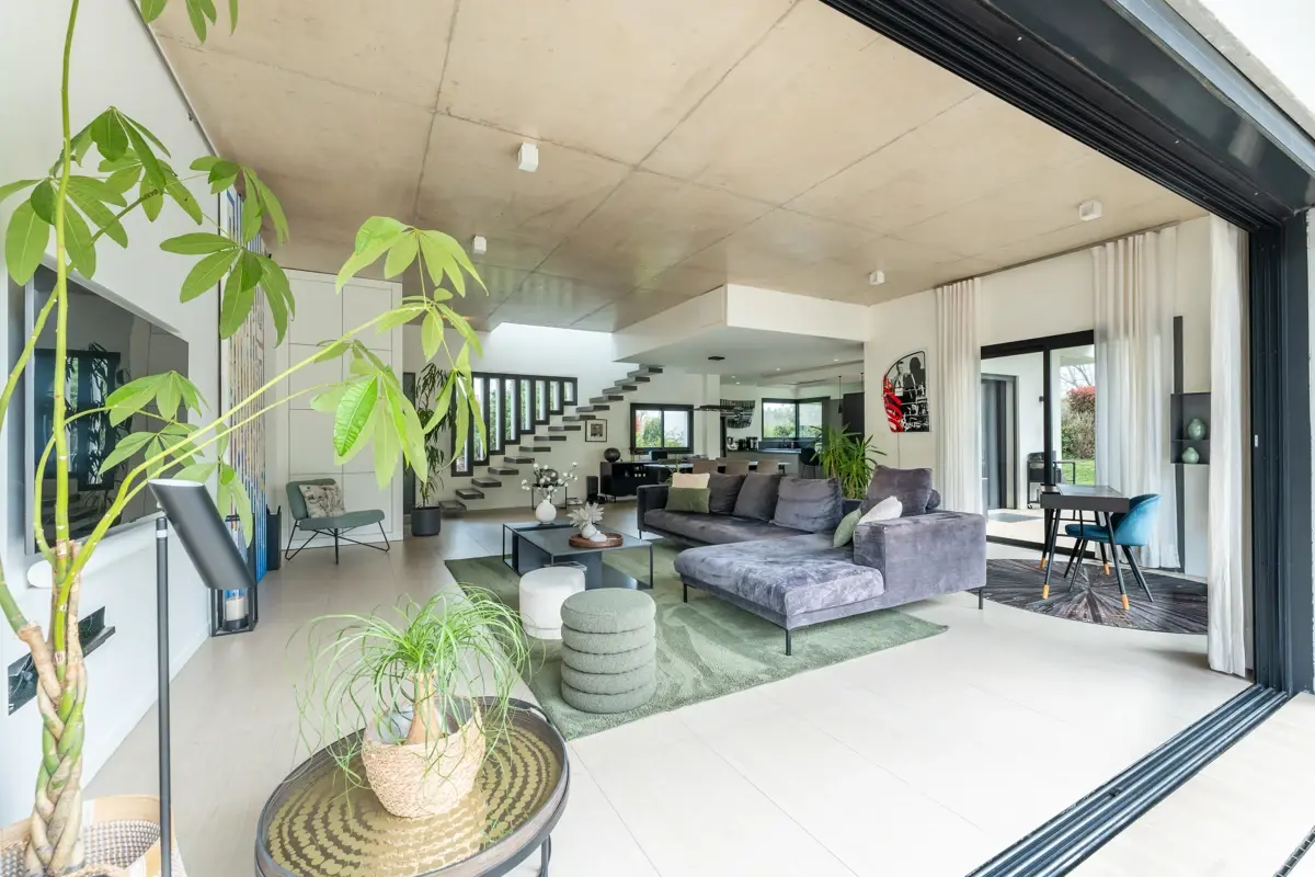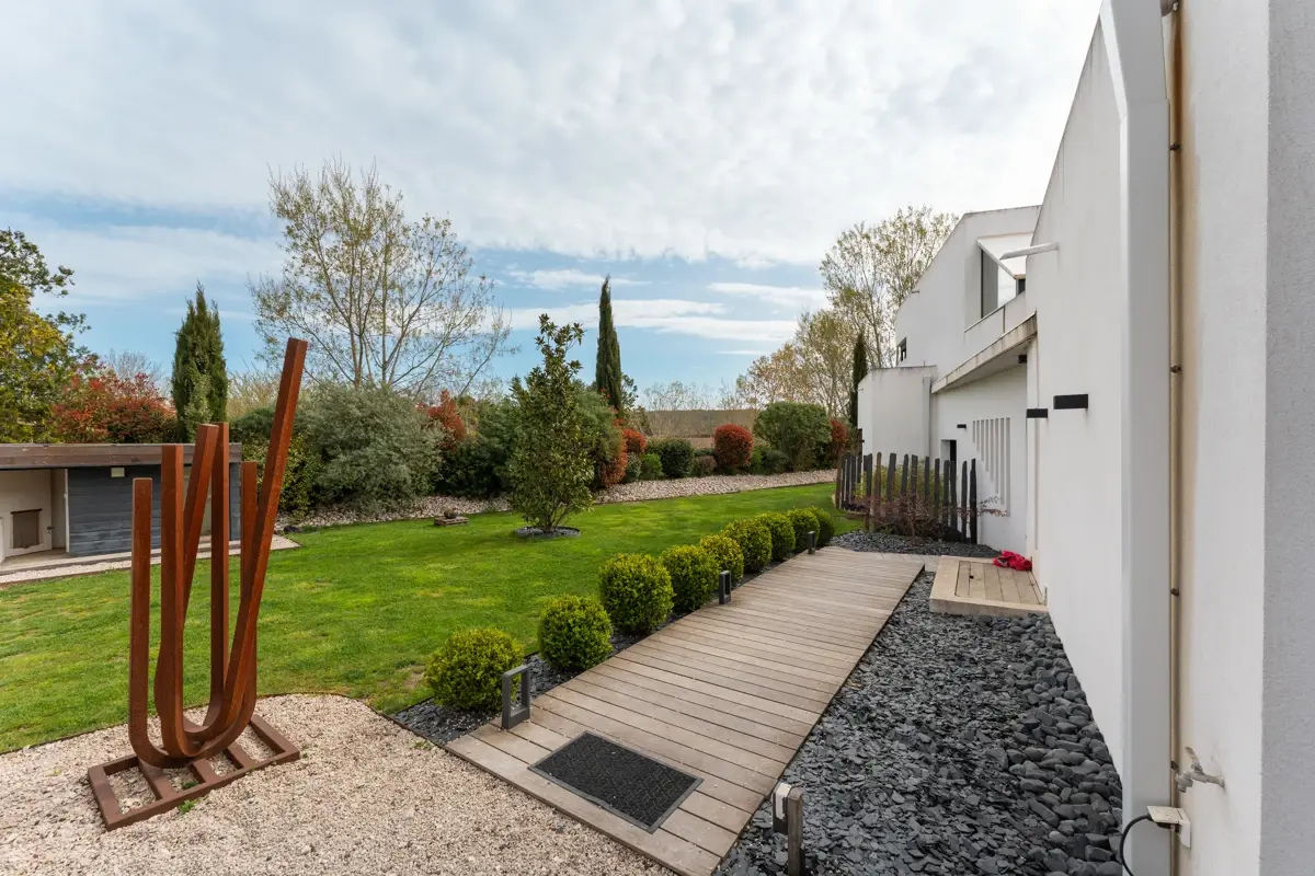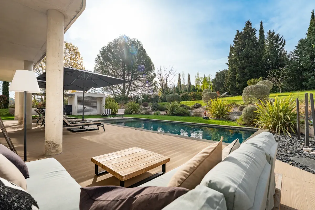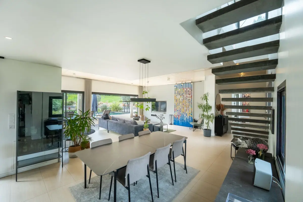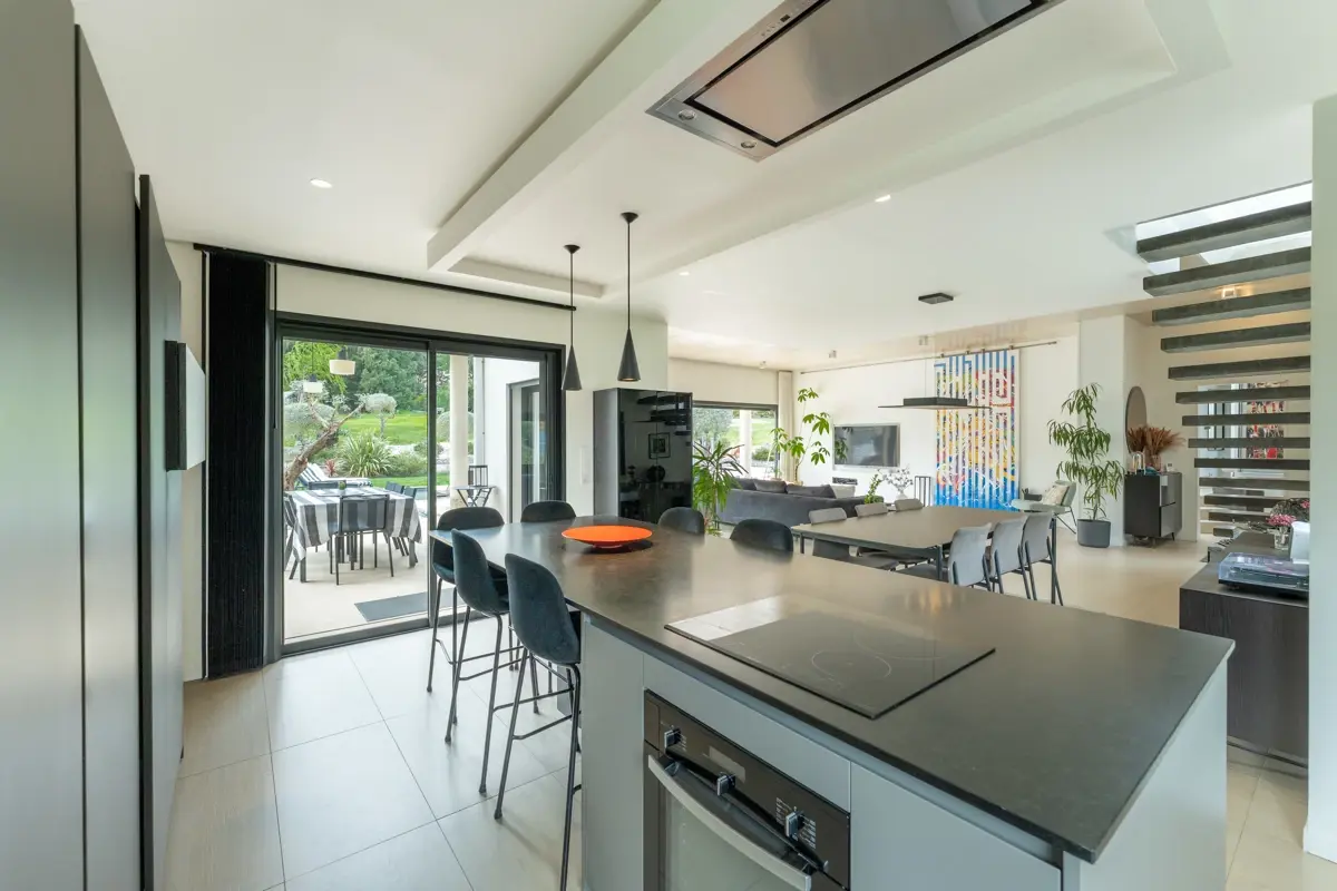 Villa moderne de 10 ans avec vastes ouvertures vitrées sur terrasses, piscine et jardin paysagé de 3200 m². Comprend trois chambres au rez-de-chaussée, une suite parentale à l'étage avec terrasse, plus un double garage et un appartement T2 de 40 m².