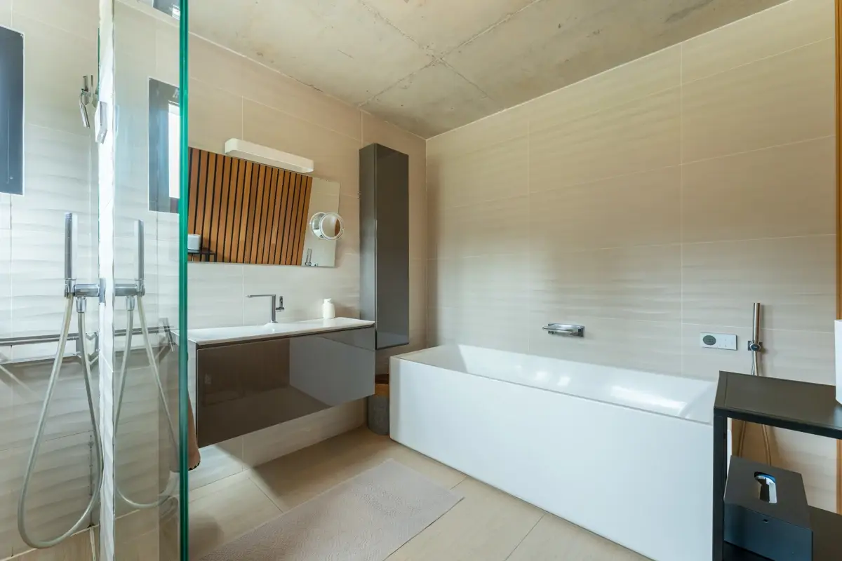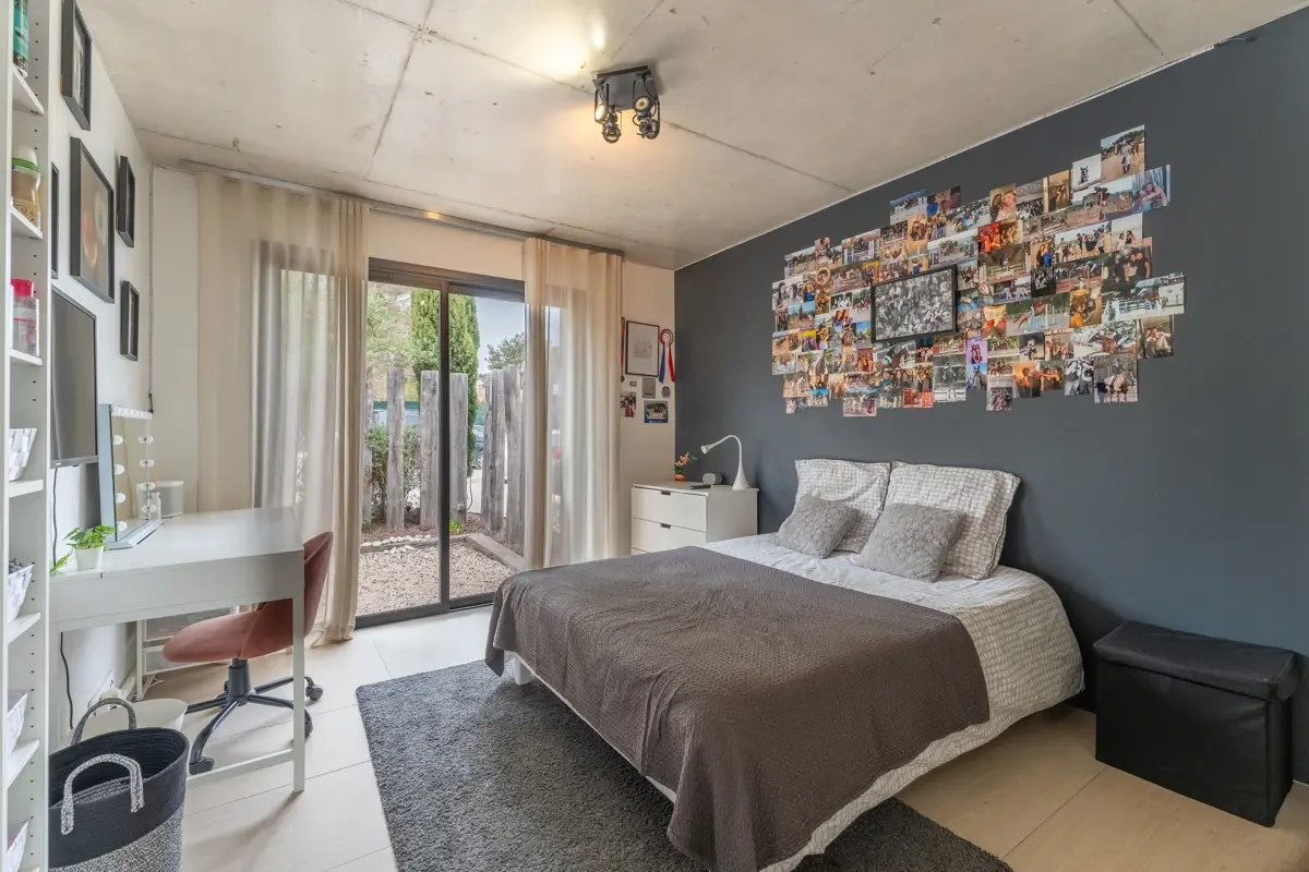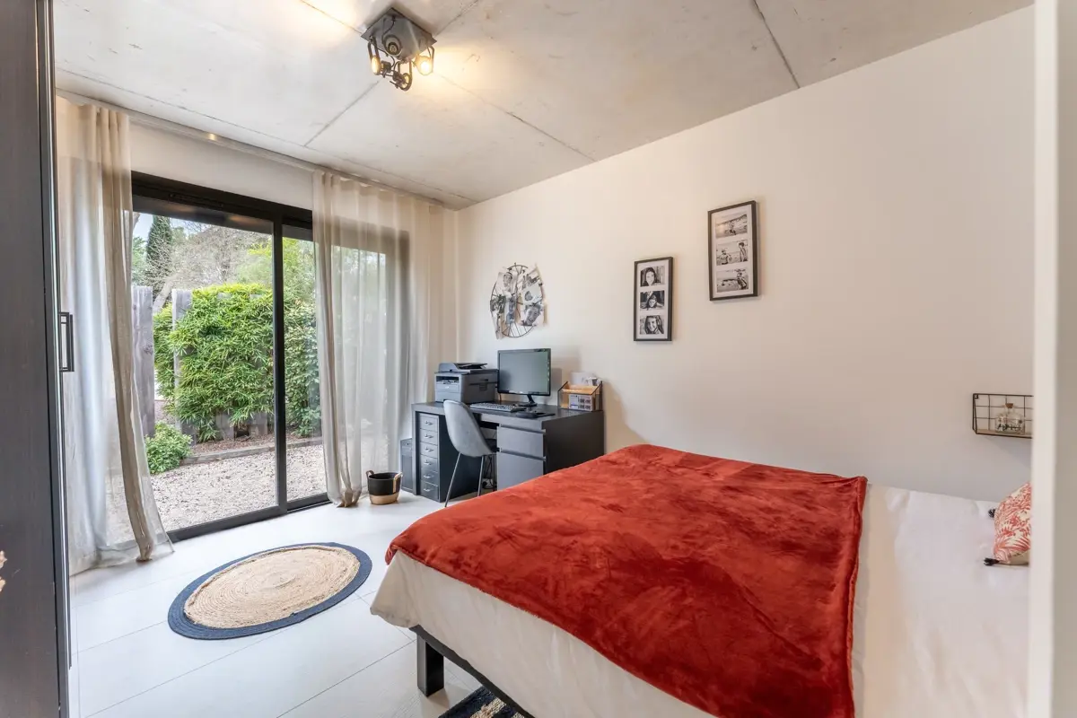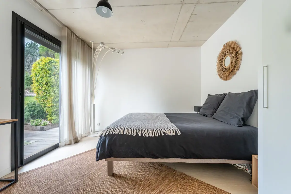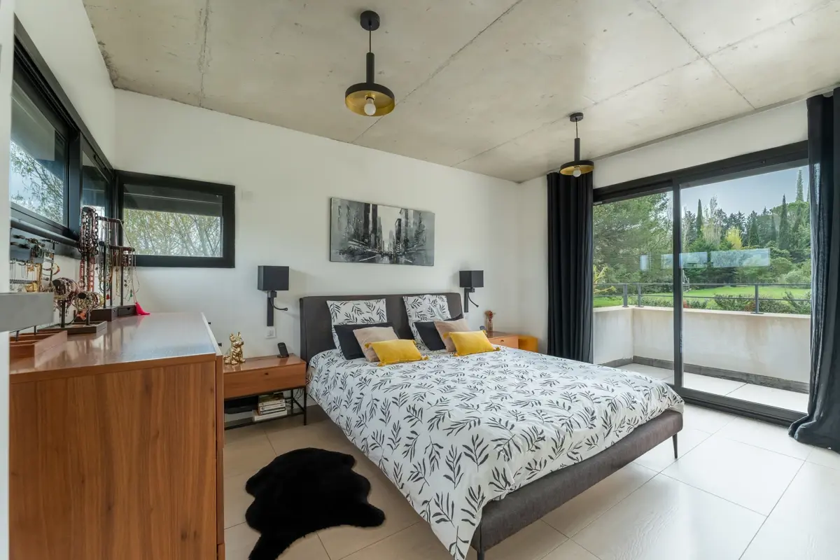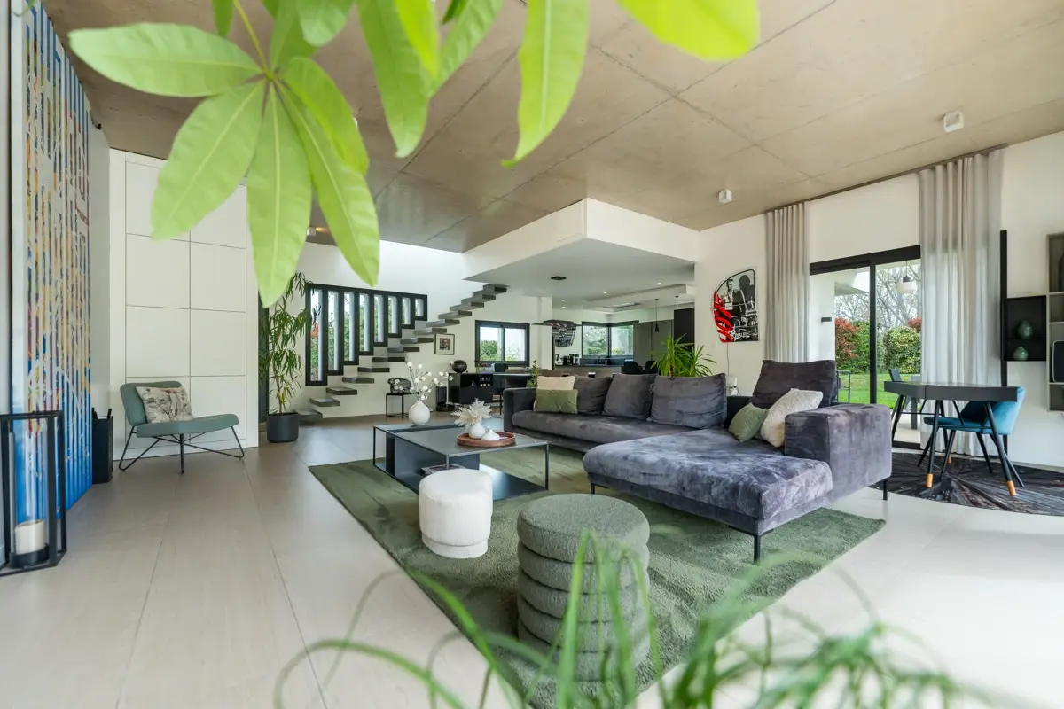 Villa moderne de 10 ans avec vastes ouvertures vitrées sur terrasses, piscine et jardin paysagé de 3200 m². Comprend trois chambres au rez-de-chaussée, une suite parentale à l'étage avec terrasse, plus un double garage et un appartement T2 de 40 m².