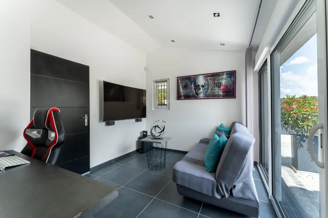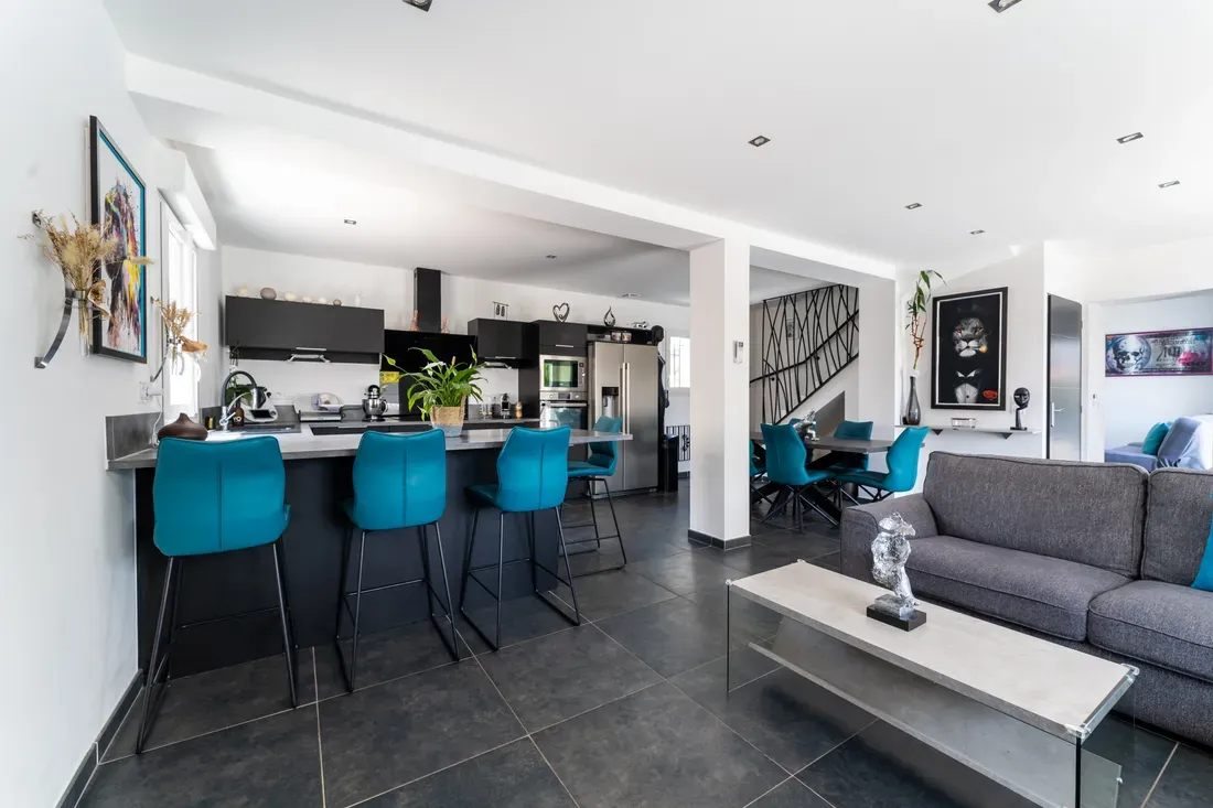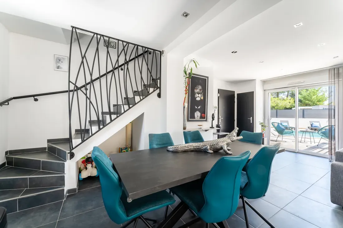 Maison familiale d’environ 115 m² offrant une pièce de vie lumineuse avec cuisine ouverte entièrement équipée, ouvrant sur la terrasse en travertin et la pergola bioclimatique. Au rez-de-chaussée : WC invités, chambre d’appoint/bureau (environ 13 m²) avec placard et cellier/buanderie accessible depuis une terrasse arrière.