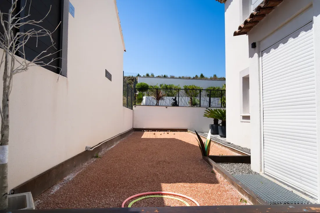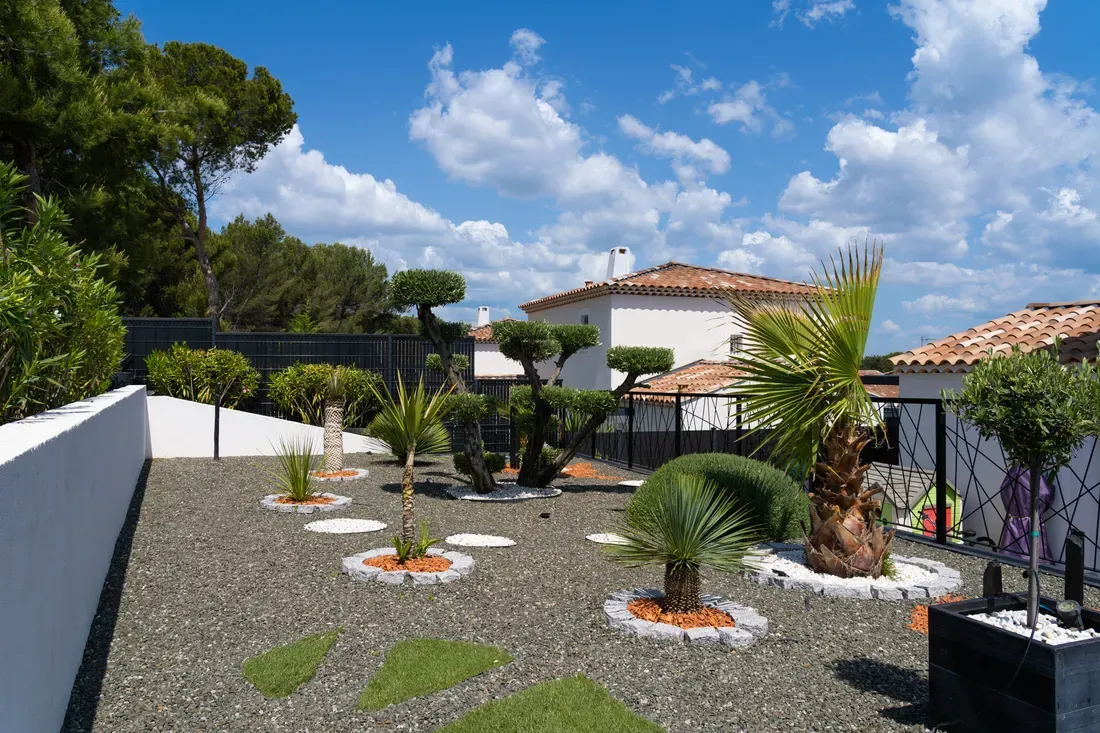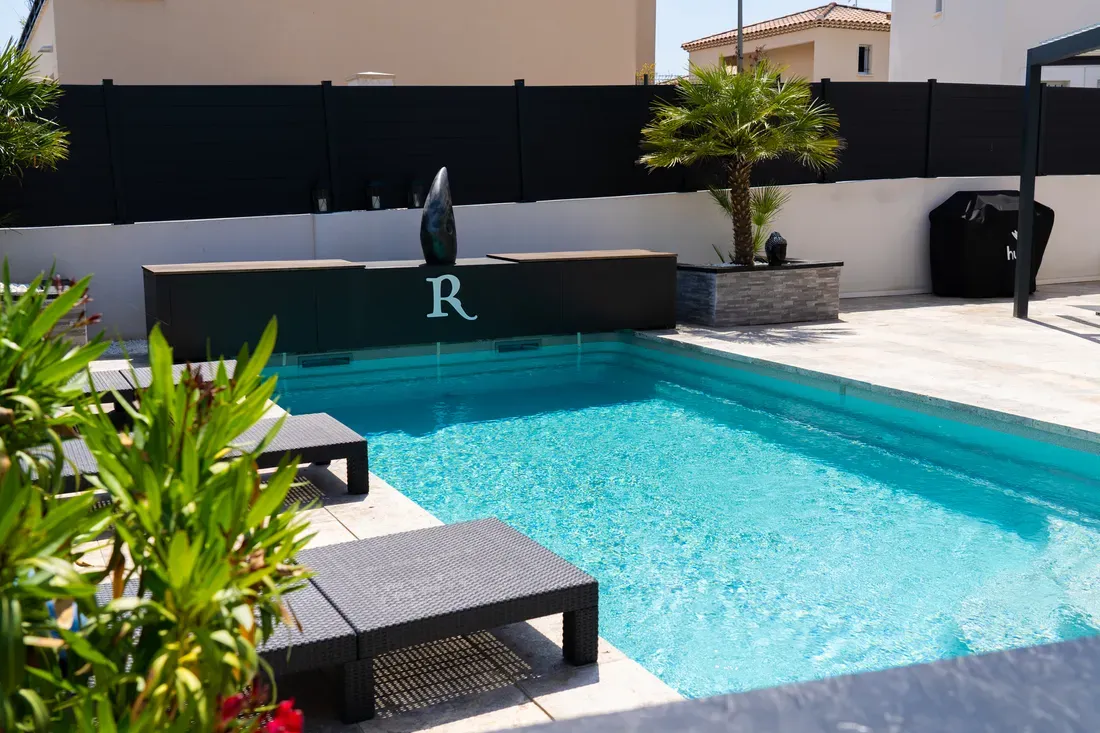 Extérieurs soignés avec terrasse travertin, pergola bioclimatique, piscine coque traitée au sel (7,2 x 3,60 m) équipée d’un volet roulant motorisé, multiples terrasses bien exposées et boulodrome.