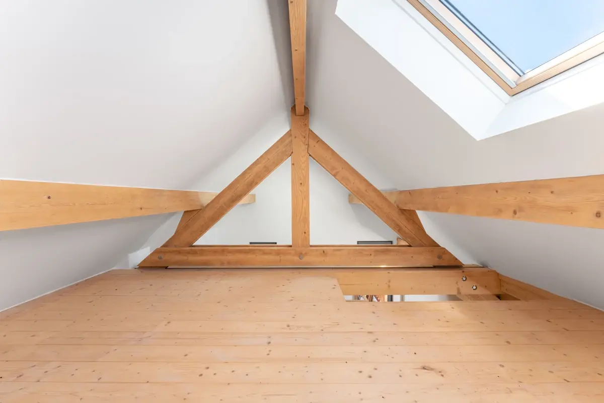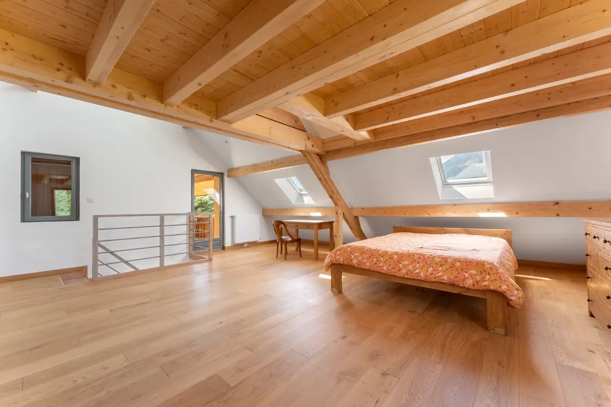 A l'étage, la chambre de 25m²environ s'ouvre sur une terrasse abritée, offrant une vue dégagée sur les montagnes et sur le lac de Serre Ponçon. Un coin nuit en mezzanine est accessible par un escalier japonais dans la chambre permettant un espace de couchage supplémentaire.