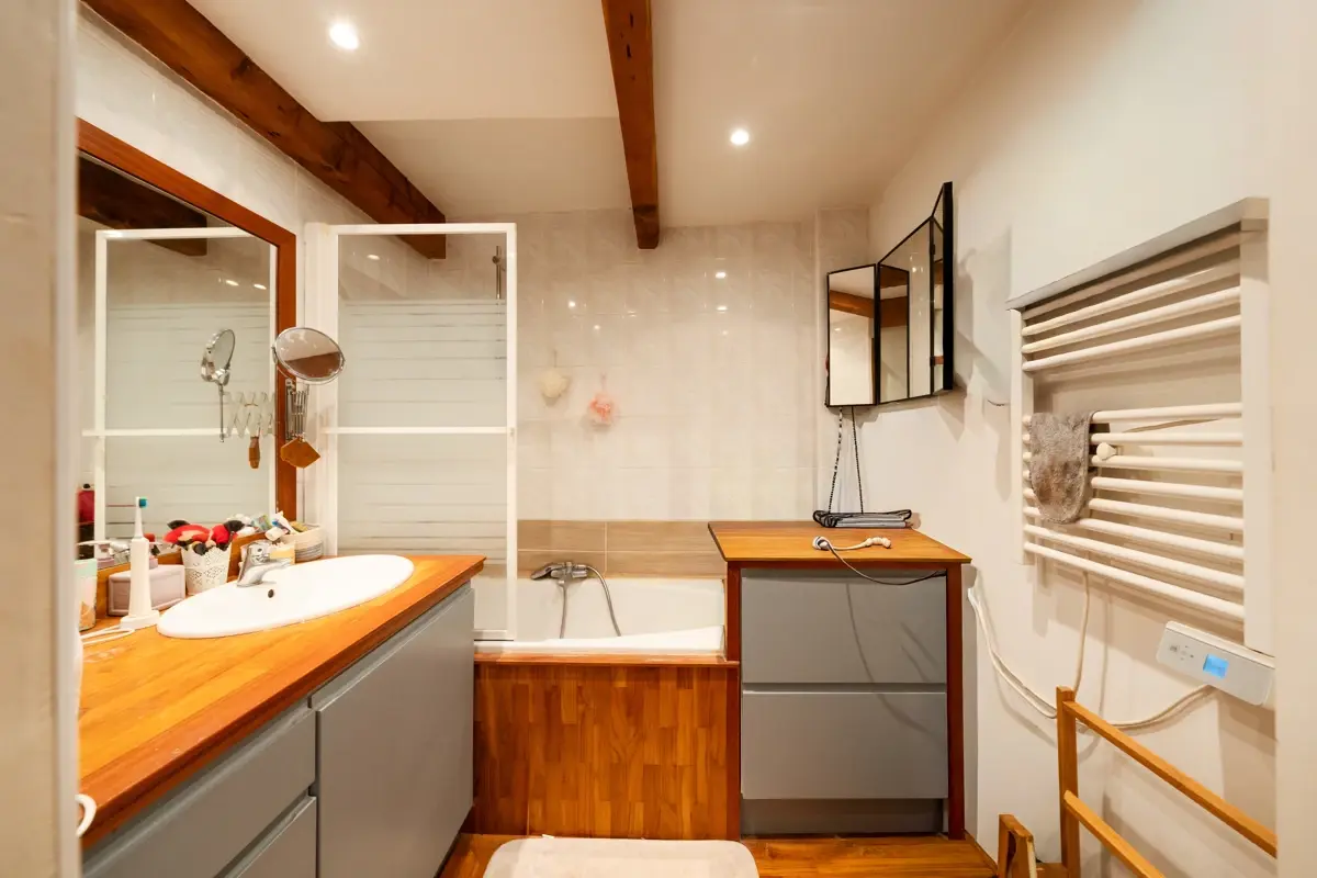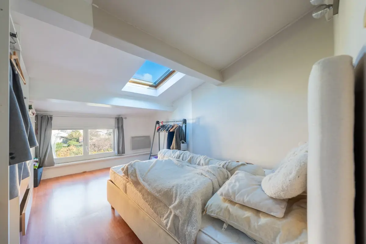 Espace nuit : au premier niveau, une chambre avec terrasse privative, un bureau, une salle de bains et un WC indépendant. Au second niveau, deux chambres sous-pente, un espace lave-mains avec double vasques et un second WC.