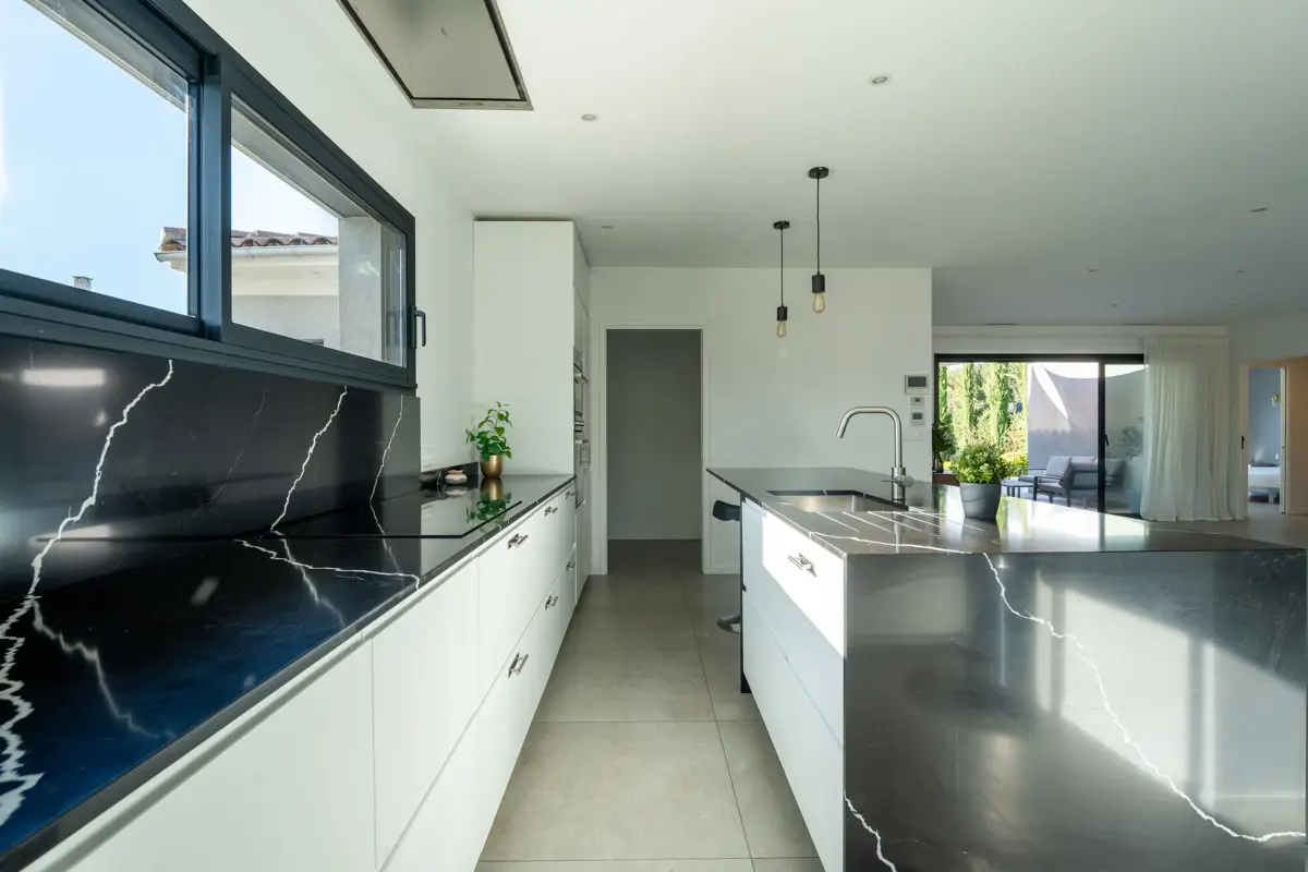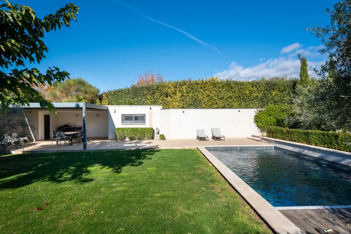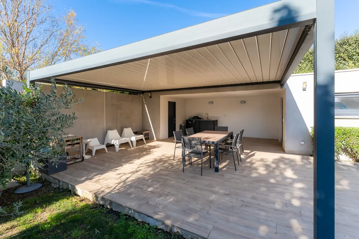 Le terrain de 1 200 m² est pensé pour la détente, avec une terrasse de 100 m² orientée sud-ouest, une piscine au sel, pergola bio-climatqieu et pool house équipé.