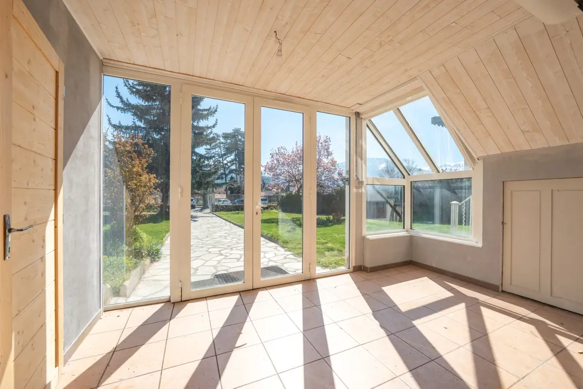Profitez d'un jardin arboré et clôturé d'environ 700 m², ainsi que d'une grande terrasse exposée sud avec vue sur les montagnes.