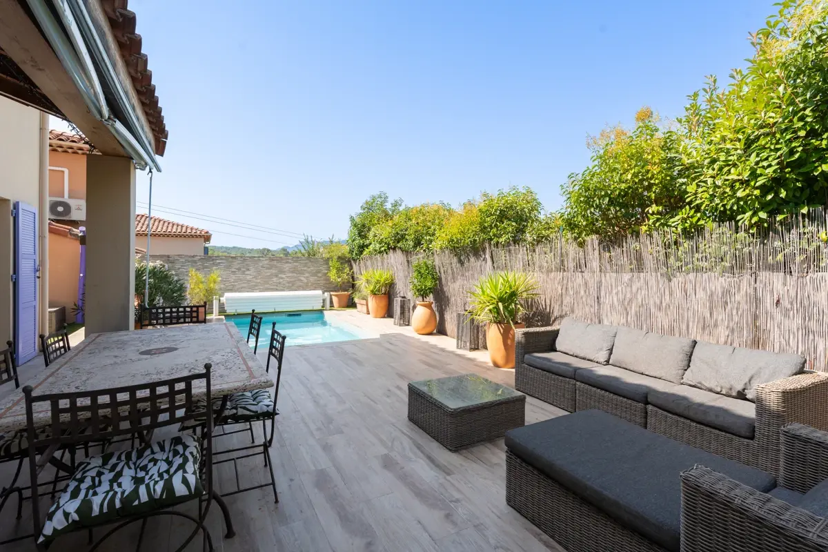 La maison dispose d'une terrasse agréable avec une piscine et d'un garage de 15m².