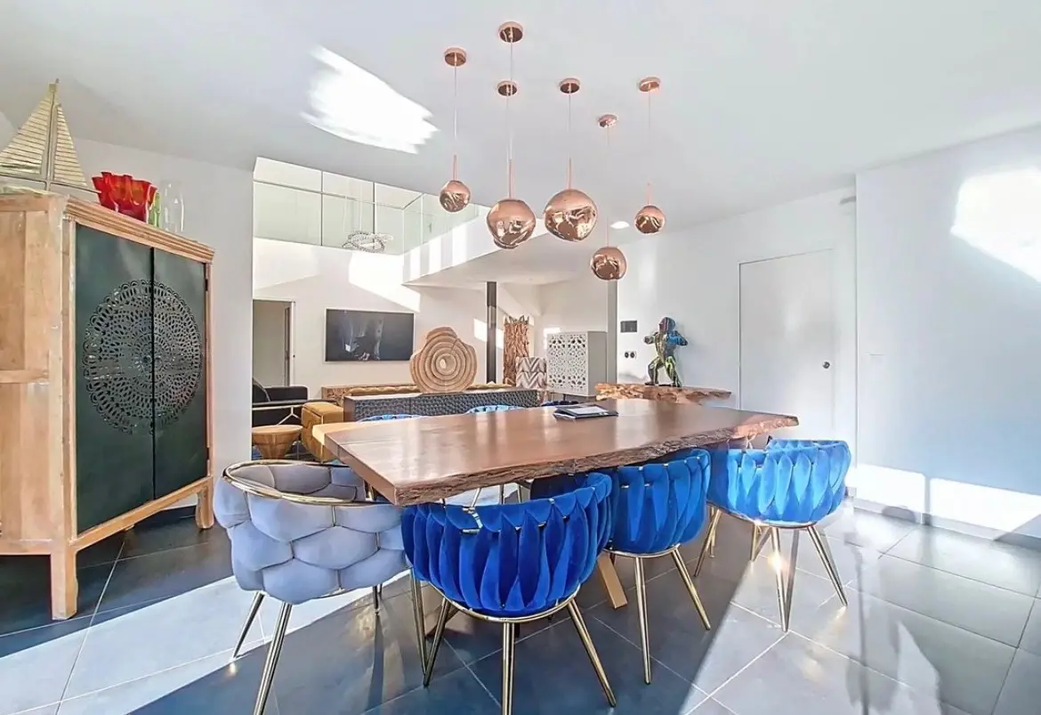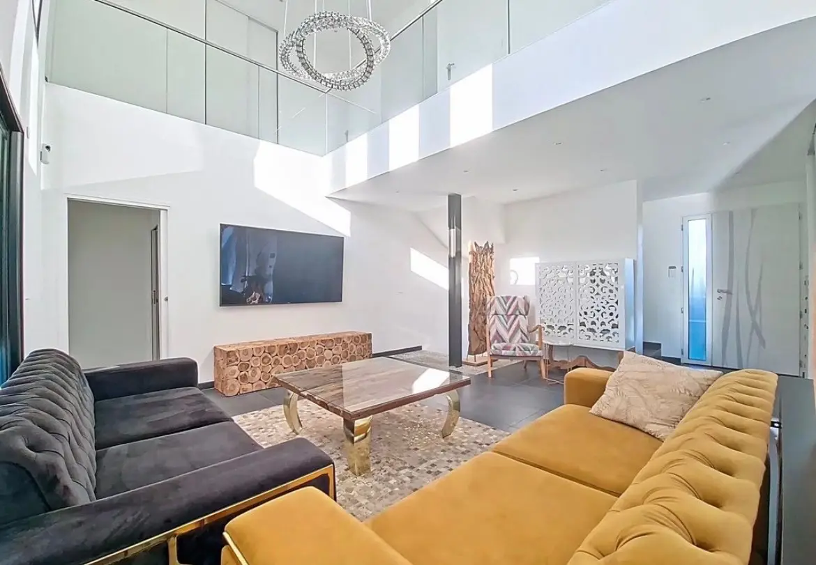 Villa d’architecte contemporaine de 276 m² habitables, offrant une spectaculaire pièce de vie de 80 m² avec salon cathédrale, volumes généreux et larges baies vitrées, assurant une luminosité remarquable tout au long de la journée.