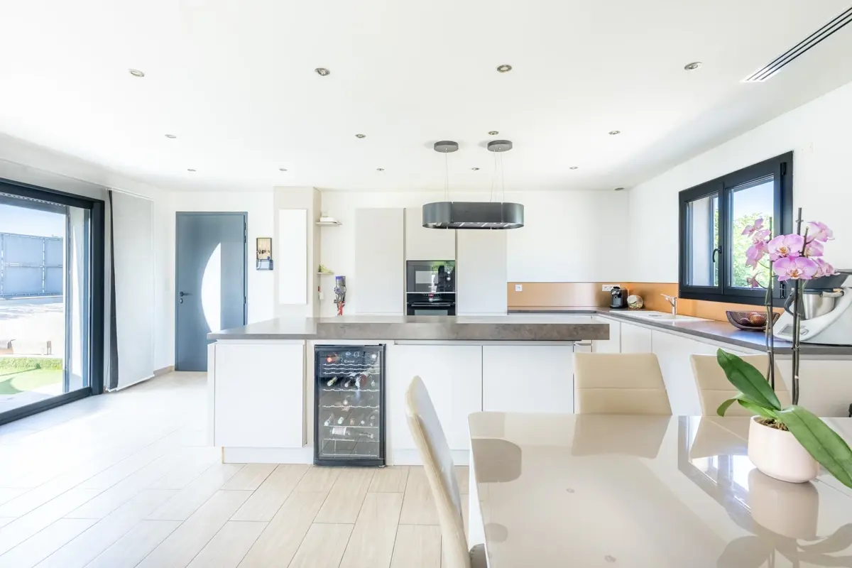 Cette maison construite en 2016 offre environ 100 m² de surface habitable. Vous y découvrirez une pièce de vie lumineuse avec une cuisine américaine entièrement équipée, incluant un îlot central et une cave à vins. La maison dispose d'une vaste cave de 55 m², idéale pour différents aménagements selon vos besoins.