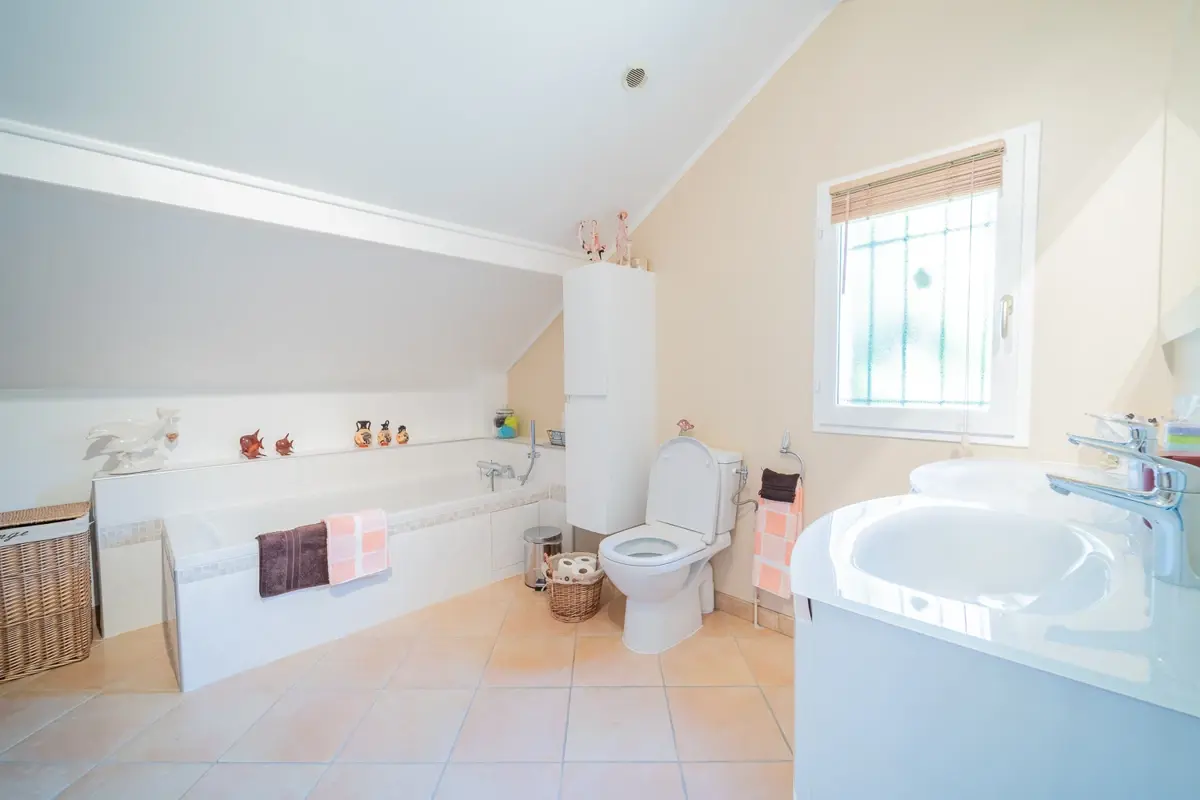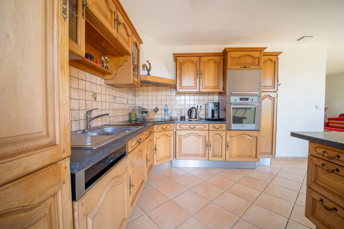 Intérieur lumineux avec salon, cheminée, salle à manger ouverte et cuisine équipée. Une chambre confortable à mi-niveau, trois chambres à l'étage dont deux avec accès au balcon, et un espace bureau. Extérieurs avec piscine au sel, abri de jardin, vaste terrasse de 84m² sous pergola et diverses plantes et arbres fruitiers. Grande buanderie avec pompe à chaleur et garage avec porte électrique.