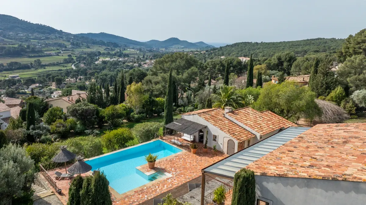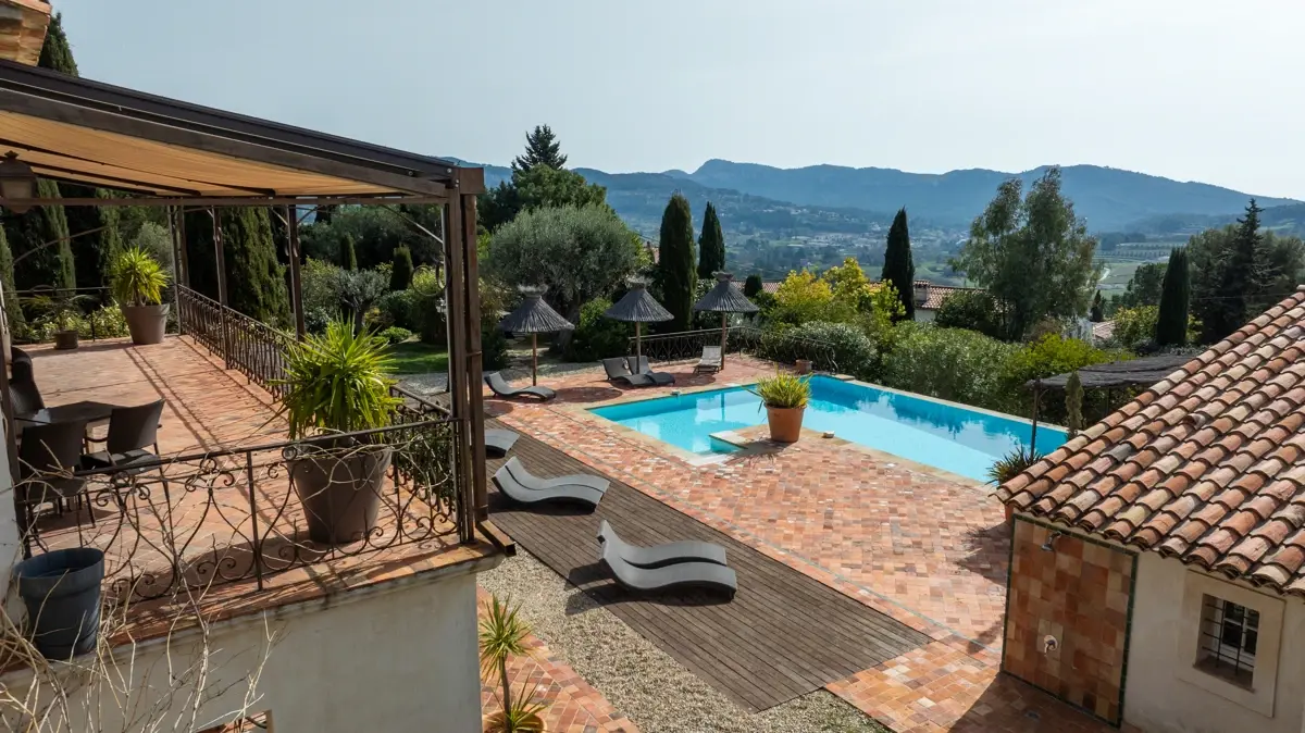 Dominant la vallée, la propriété bénéficie d’une vue panoramique à 360°, embrassant les reliefs provençaux avec un subtil aperçu sur la Méditerranée.