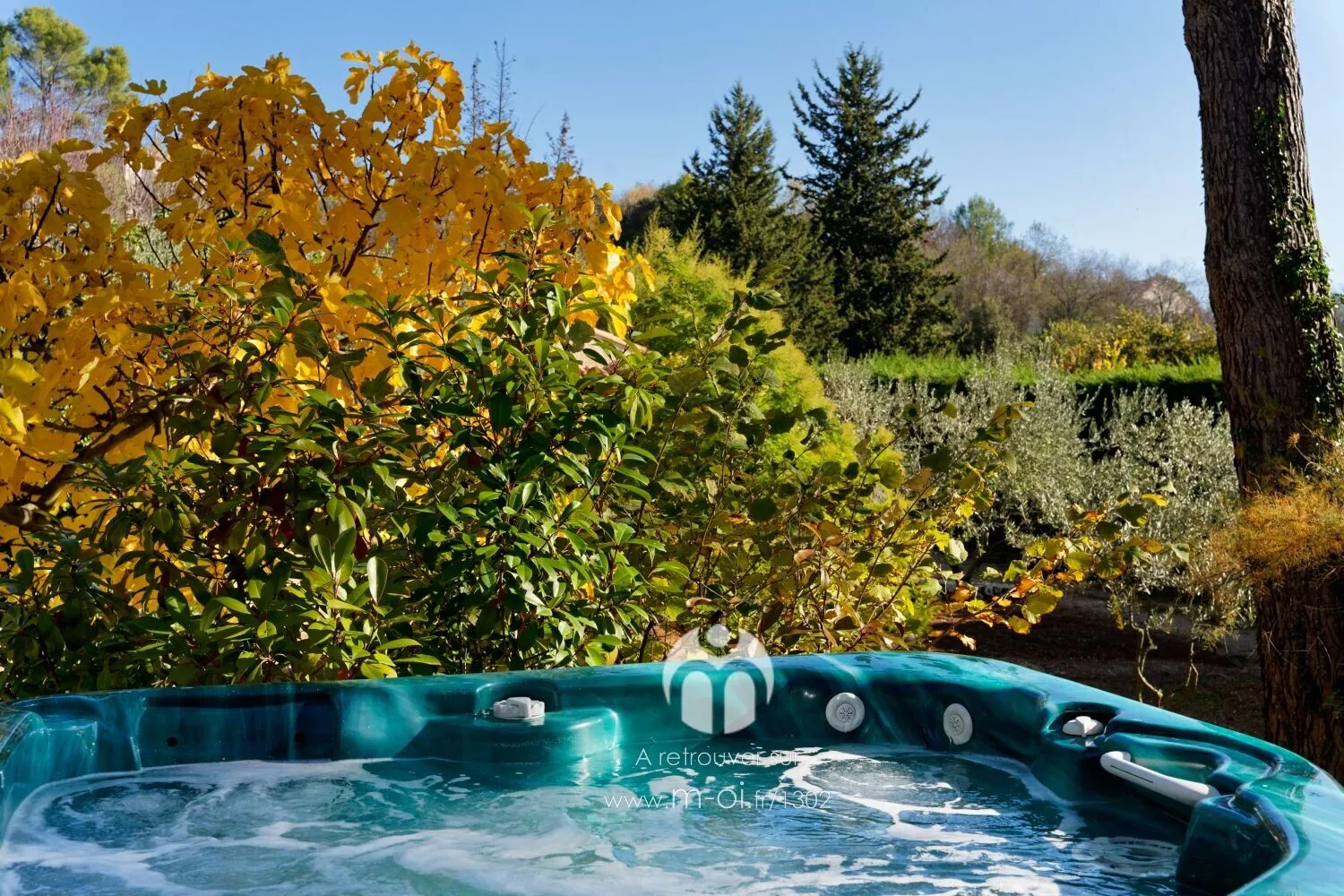 Un coin potager, un espace repas avec une grande table en pierre et un barbecue, un jacuzzi ainsi qu’un « cabanon » d’environ 25m2 pouvant être aménagé en studio ou atelier.