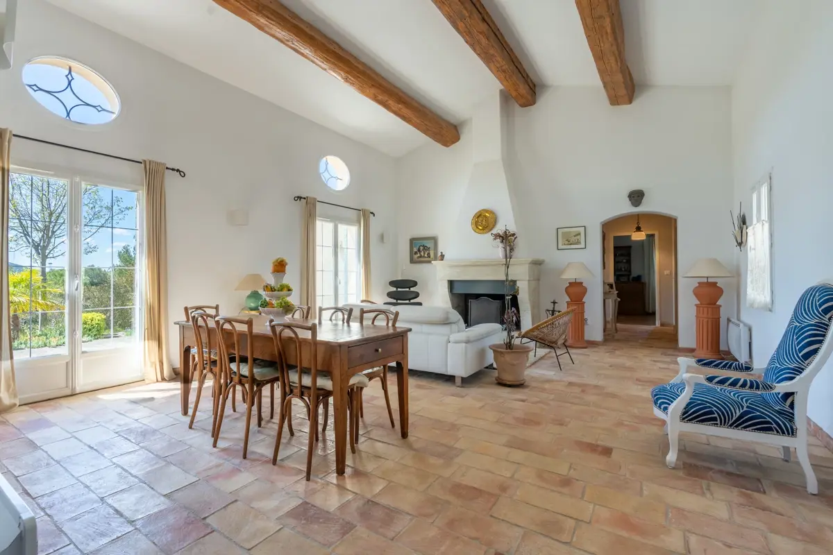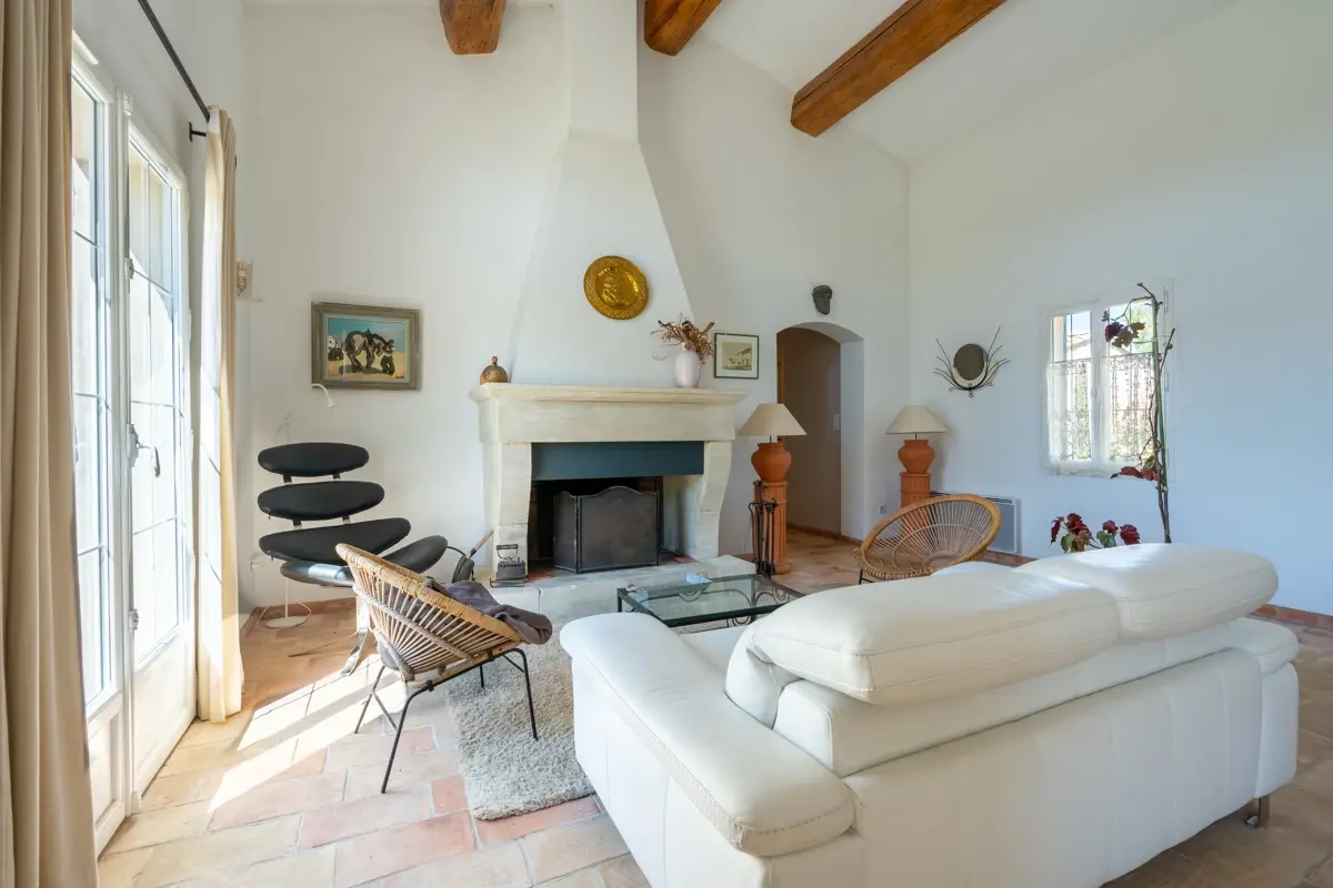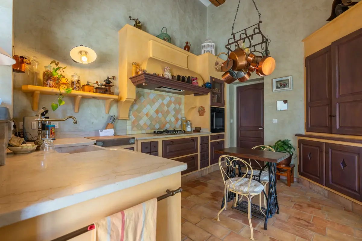 Cette villa propose un espace de vie lumineux avec cheminée et une cuisine équipée semi-ouverte et authentique des Ateliers Poivre d'Ane, complétée par une arrière-cuisine et un accès au 1er garage.