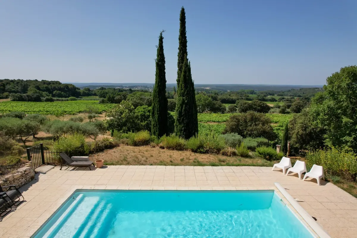 La propriété dispose d'une piscine avec pool house, offrant une vue dégagée sur la vallée environnante.