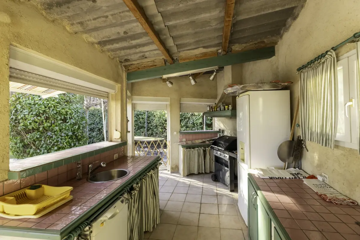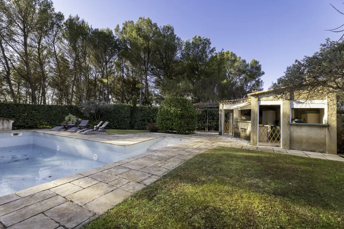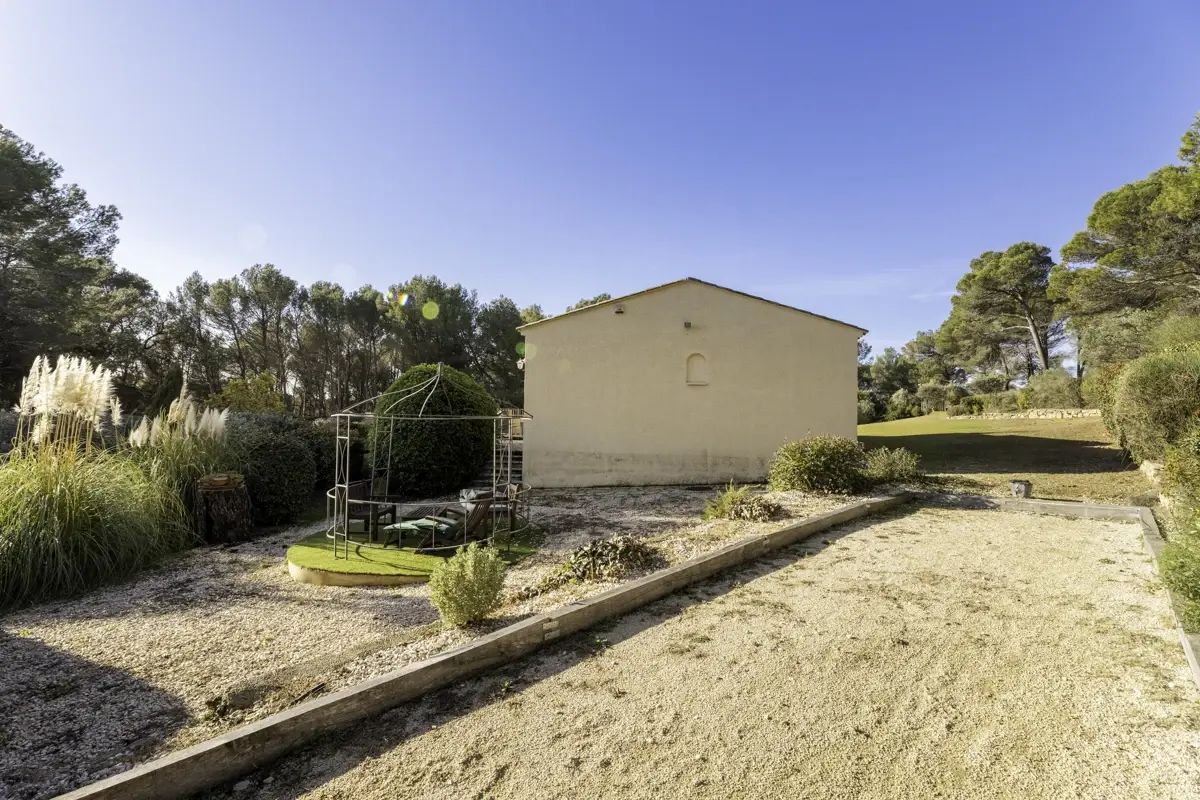 🌳 Les extérieurs constituent un véritable espace de vie supplémentaire : vaste jardin paysager, terrasse avec vue dégagée, piscine sécurisée 5 x 10 m, cuisine d’été pour vos réceptions, terrain de pétanque, et de larges espaces à vivre en famille ou entre amis.