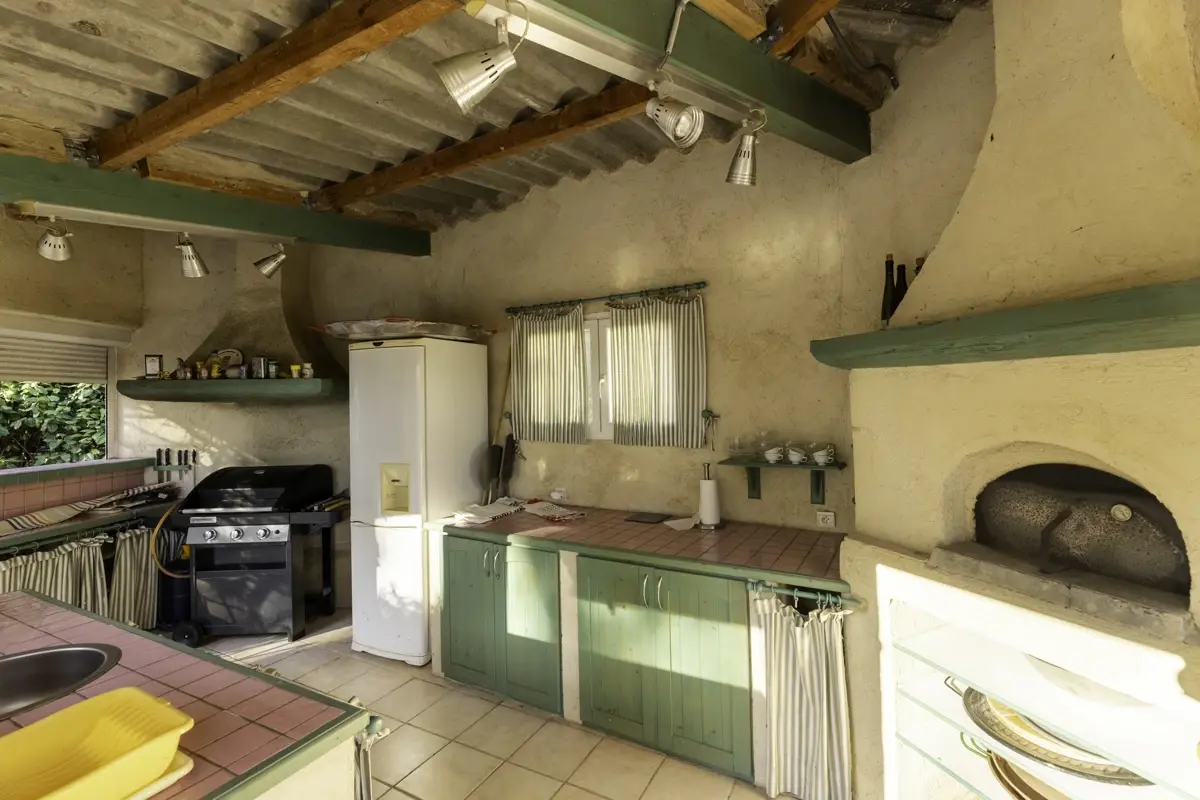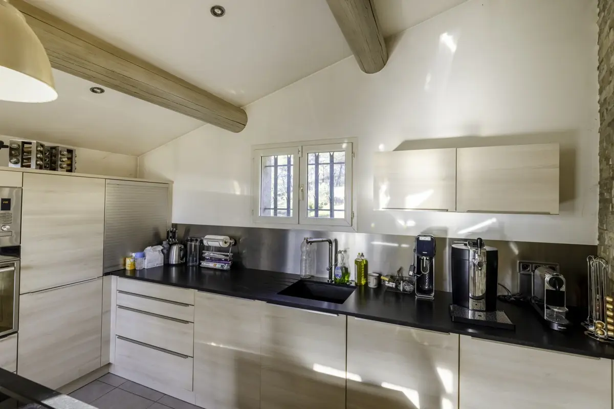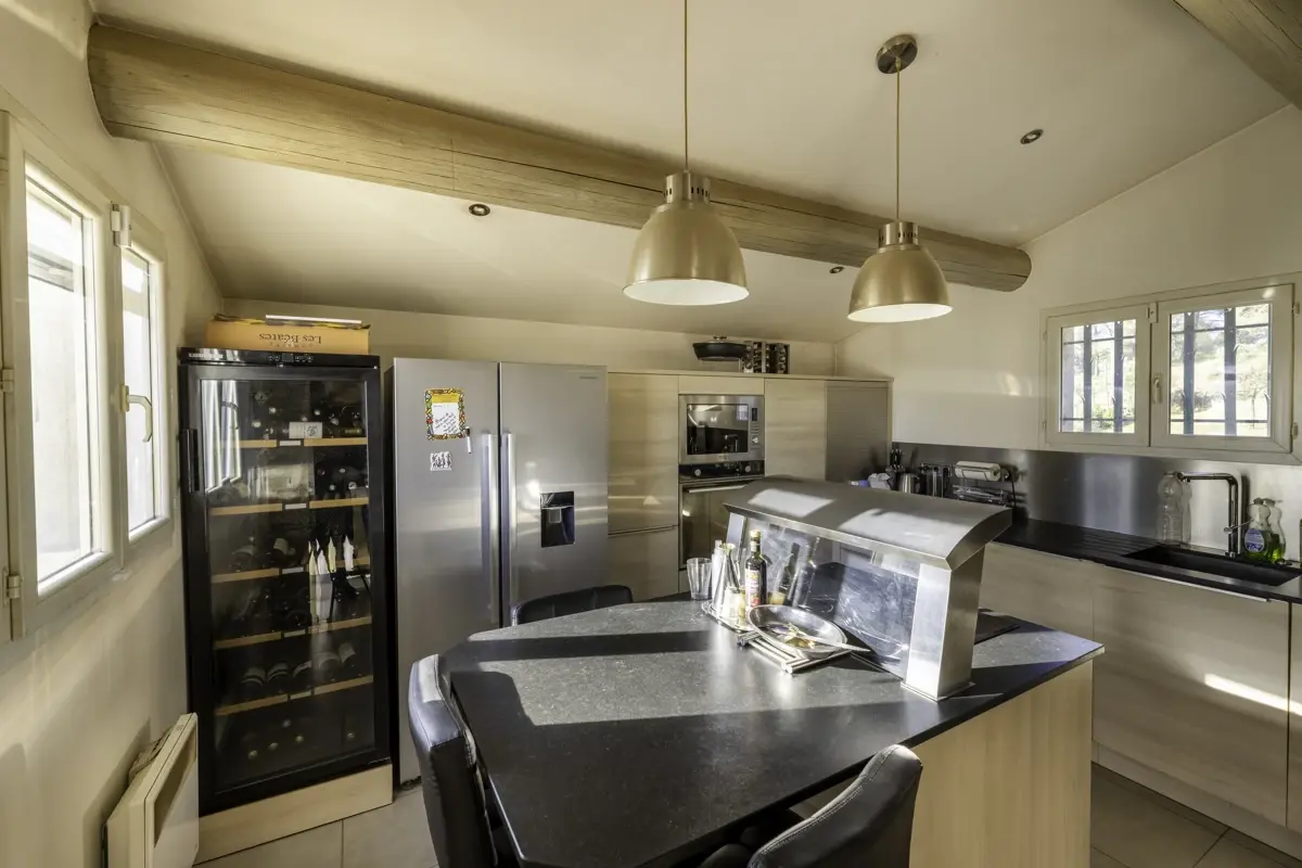 La cuisine, entièrement aménagée et équipée, est ouverte sur la pièce de vie, créant un espace chaleureux et convivial, idéal pour recevoir.