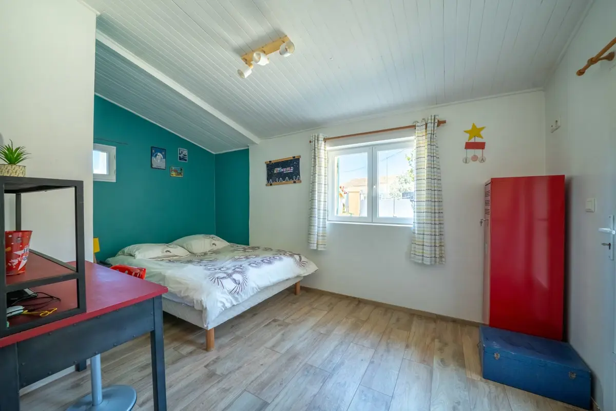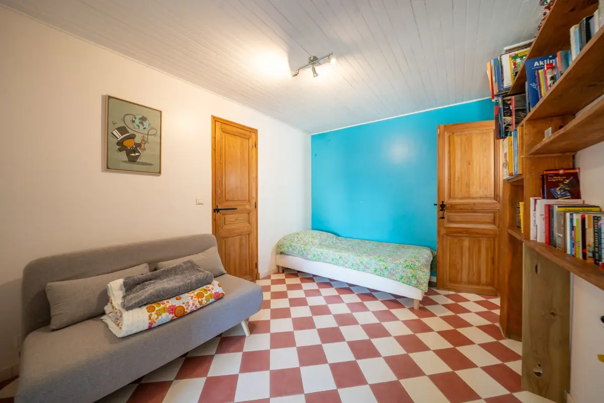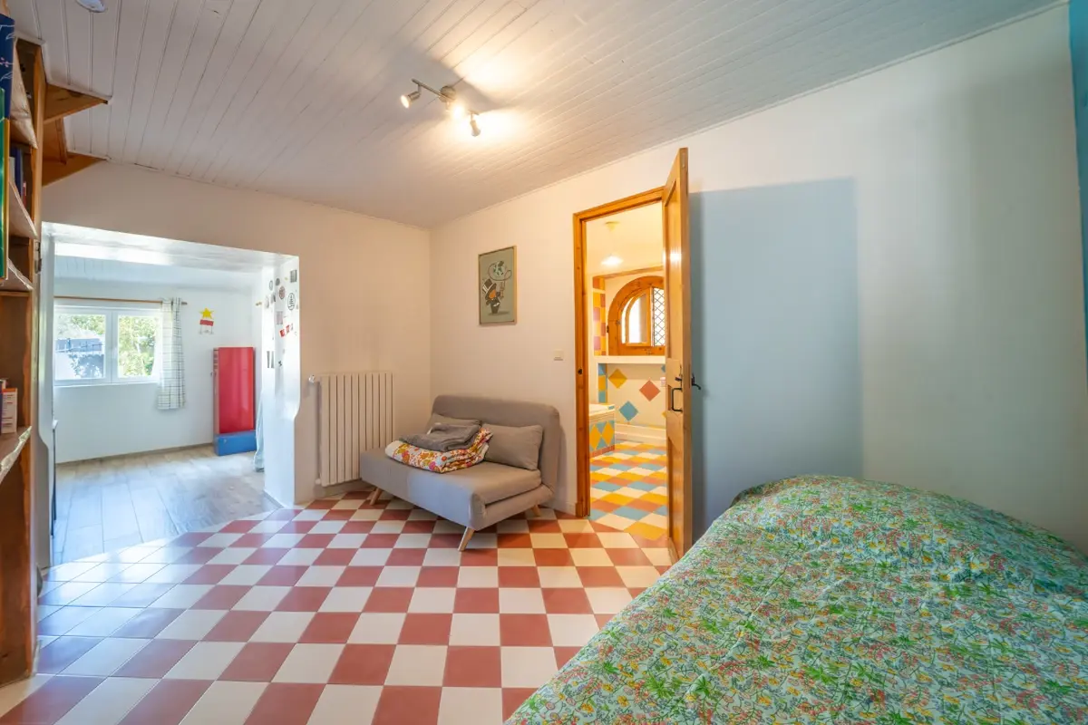 🌙 Partie nuit : Au Rez de chaussée, vous trouverez une chambre parentale avec salle d'eau et WC, en demi niveau deux chambres avec une salle de bains partagée et un WC.