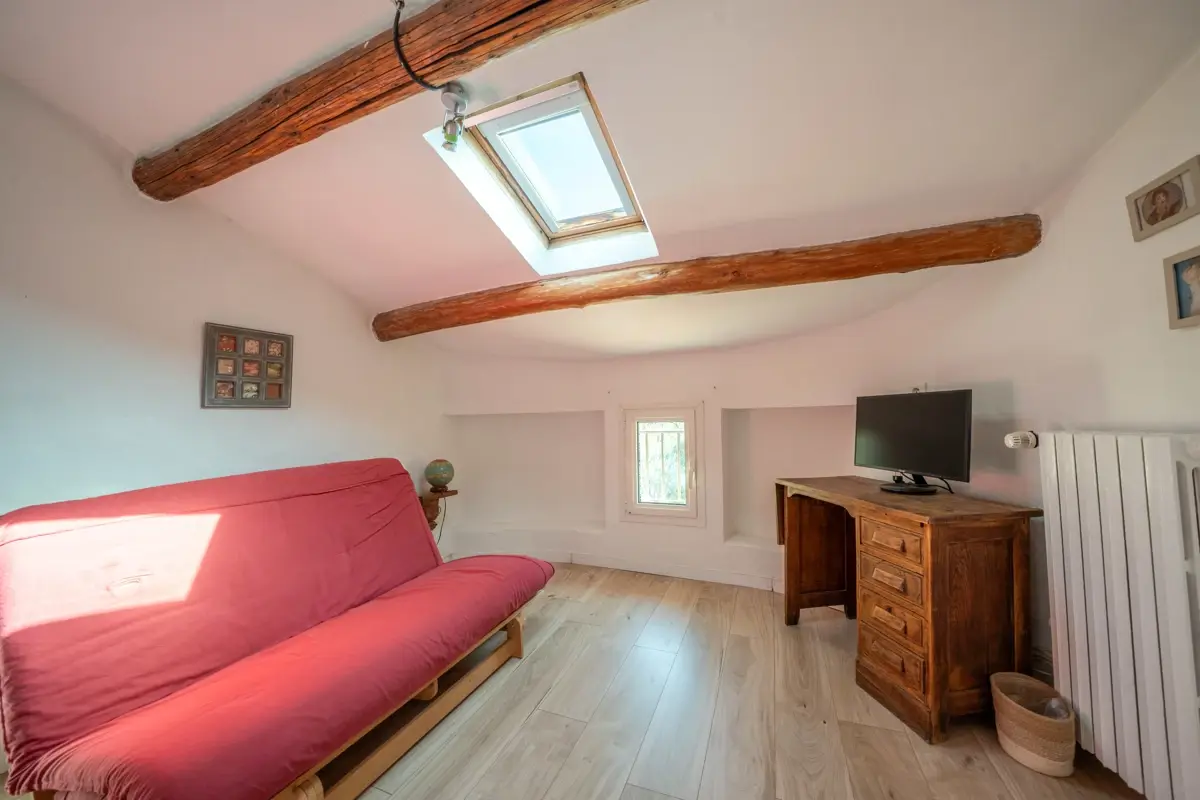 Dans le pigeonnier se trouve une petite chambre ou un bureau.