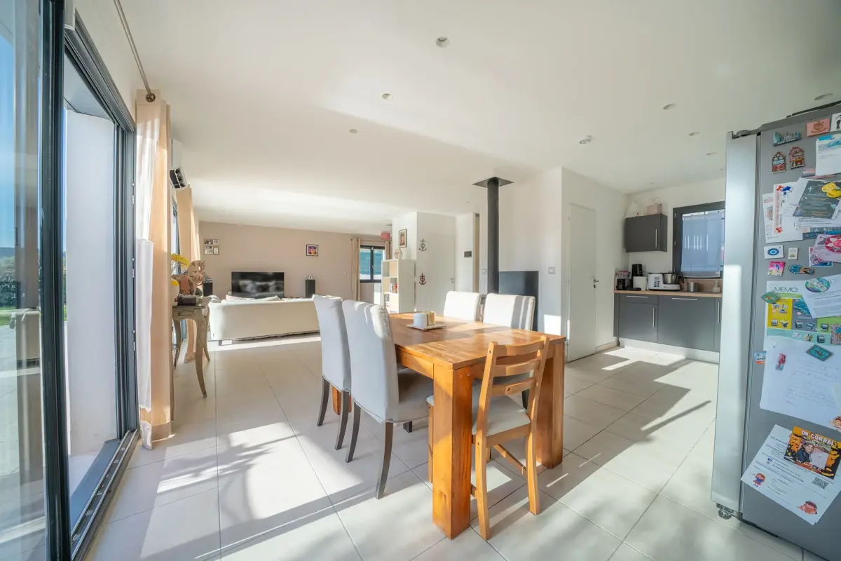 La piéce de vie de plus de 51 m2, remarquable par sa luminosité naturelle, bénéficie de deux grandes baies vitrées offrant une vue sur la piscine et le jardin, tout en donnant accès à une terrasse en travertin. La cuisine ouverte et moderne s’intègre harmonieusement à cet espace de vie convivial, agrémenté de matériaux soigneusement choisis pour garantir le confort au quotidien.