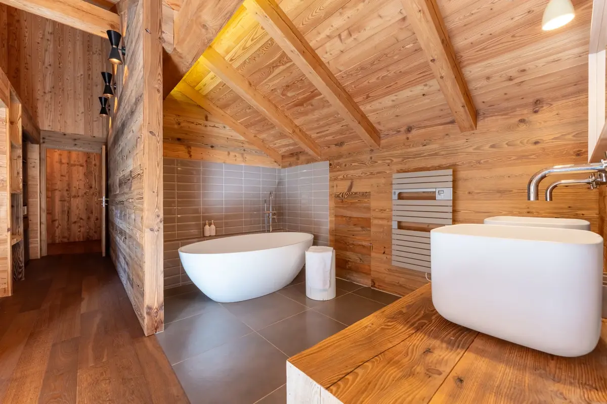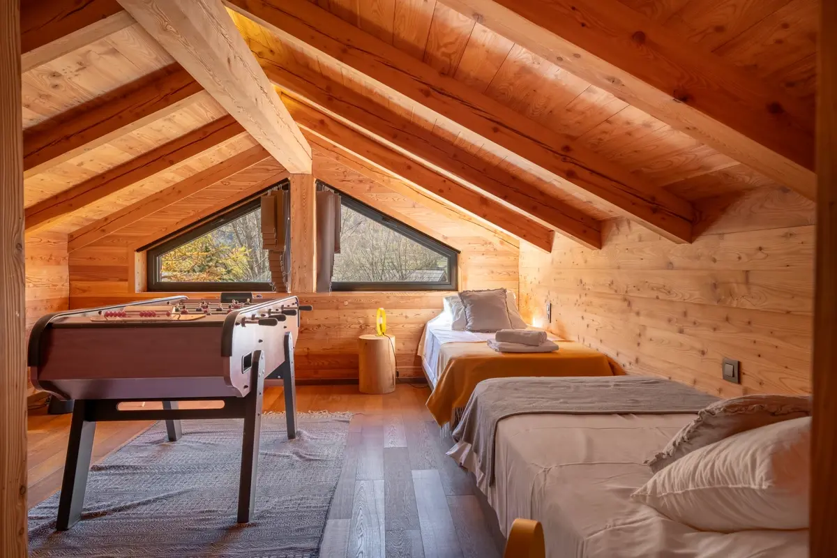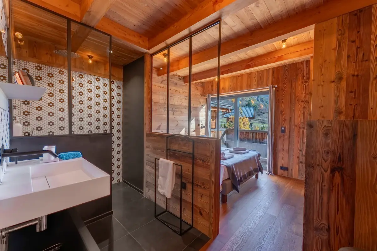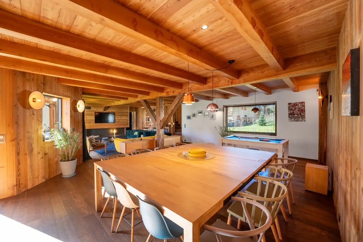Le chalet peut accueillir 15 personnes avec ses 7 chambres, dont une suite parentale avec mezzanine et une master room avec salle de bain. Cinq salles de bain sont à disposition pour un confort optimal.