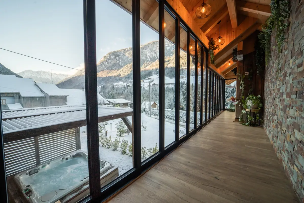 Ce chalet de plus de 400 m² a été rénové en 2019 et propose de grands volumes avec plancher chauffant. Le rez-de-chaussée comprend un espace bien-être avec hammam, sauna et spa extérieur. Le deuxième étage dispose d'une pièce de vie de plus de 100 m² incluant une cuisine SMEG équipée et un salon TV. Une salle de jeux, comprenant billard et baby-foot, et un coin lecture avec jeux d'échec, surplombent la pièce de vie.
