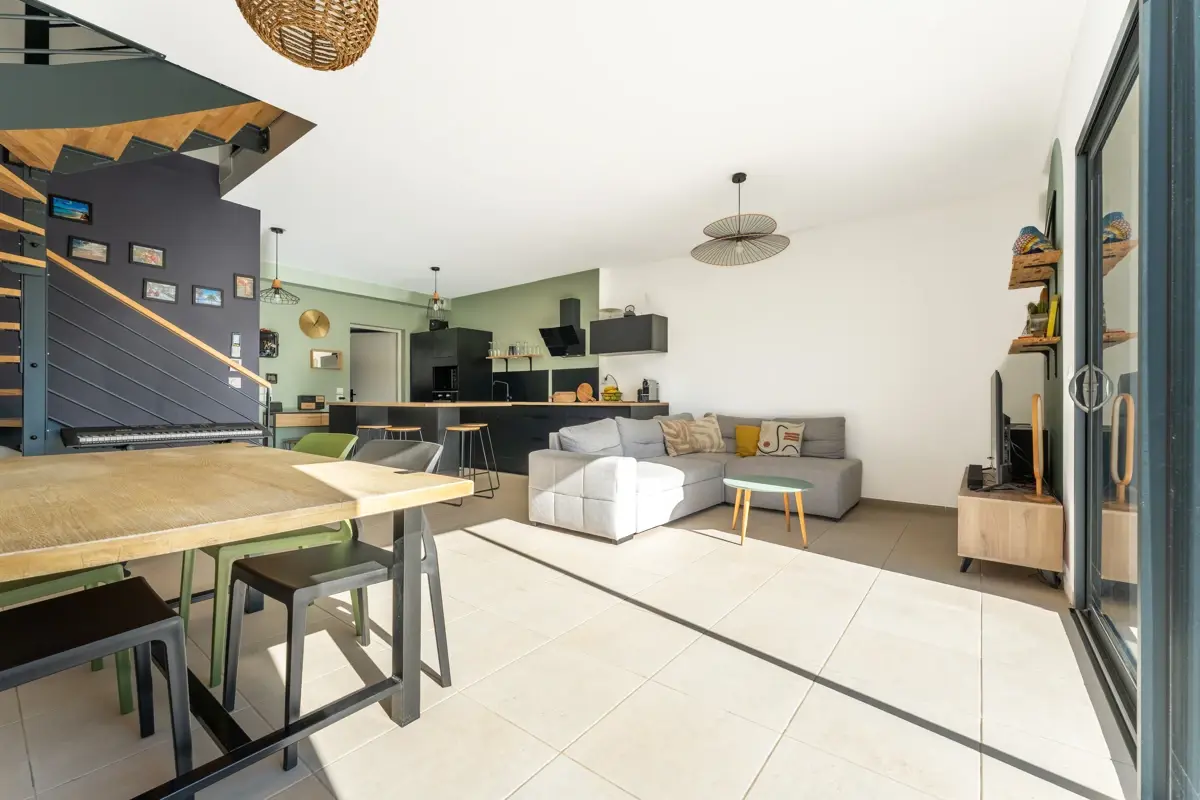 La maison propose un rez-de-chaussée lumineux comprenant une pièce de vie spacieuse avec cuisine ouverte équipée, ainsi qu'un WC et un accès direct au garage. À l'étage, vous trouverez trois chambres avec rangements intégrés et une salle de bain avec WC.