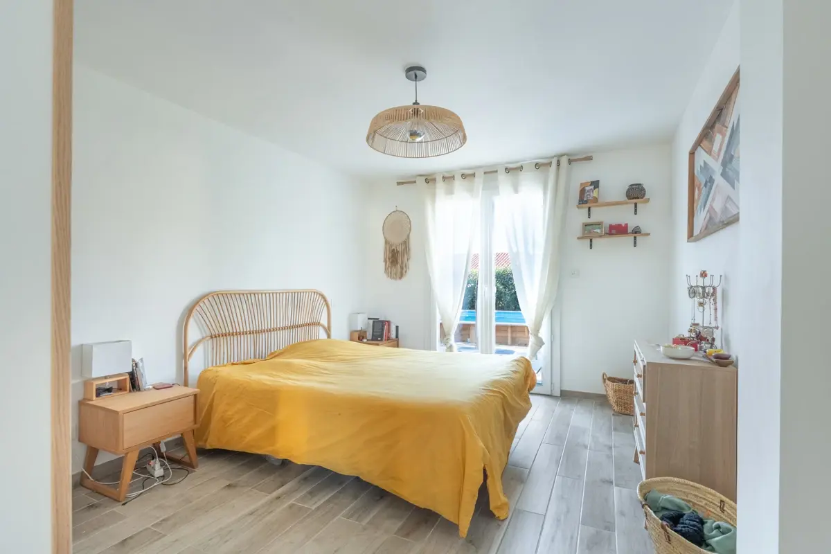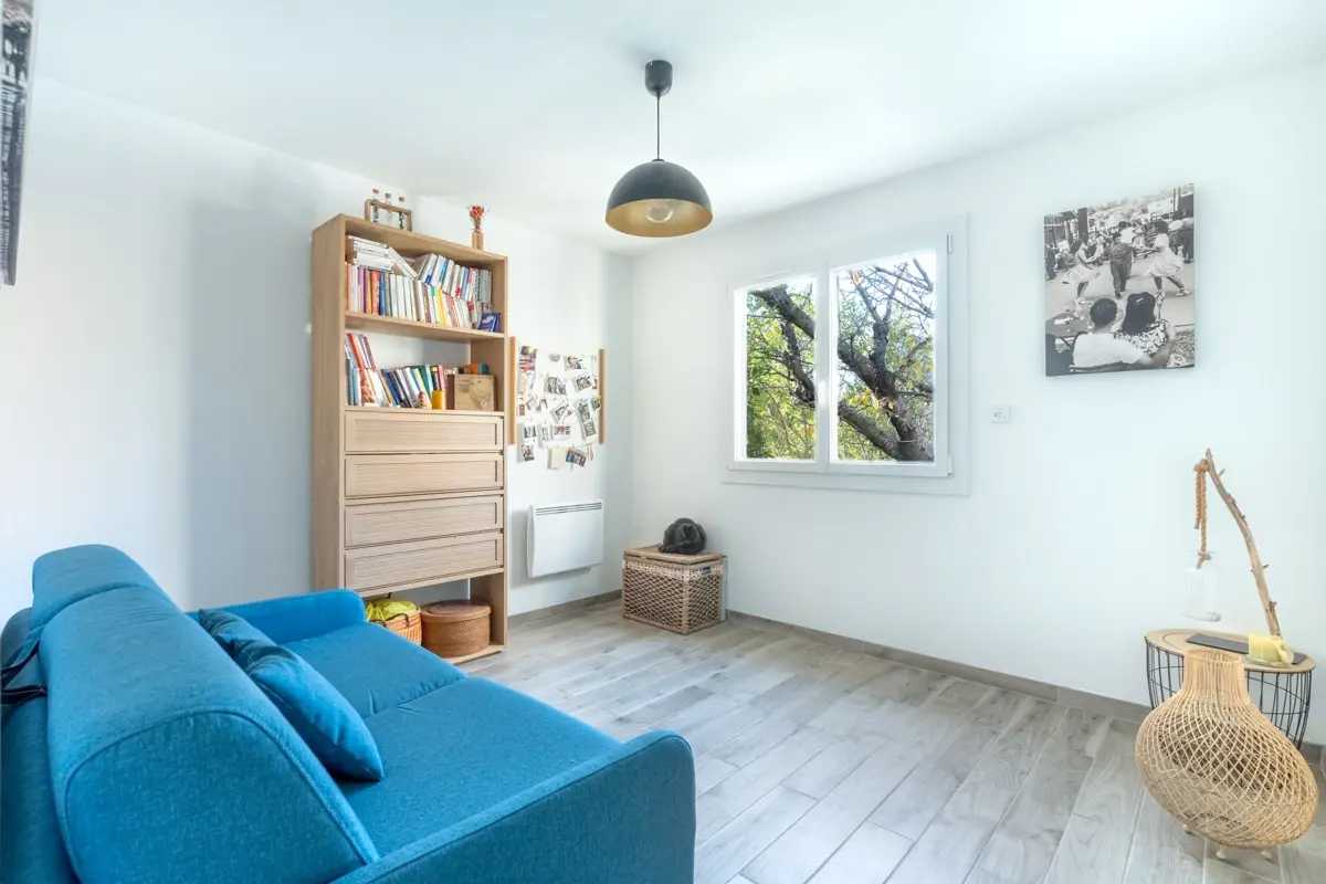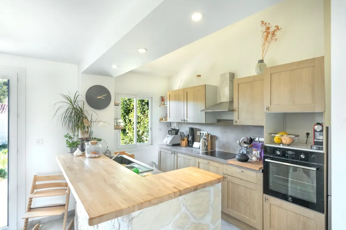 Totalement rénovée, cette maison offre une pièce de vie spacieuse et lumineuse de 48 m2 donnant sur une cuisine intégrée et une buanderie attenante. L'espace vie est ouvert sur le jardin . La surface totale est de 96 m²habitable et 20 m2 de garage.