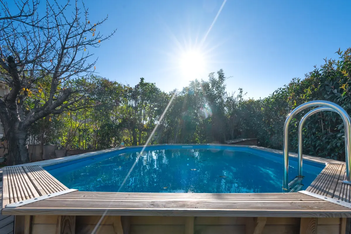 Jardin double très ensoleillé orienté est/ouest avec piscine, belle terrasse en travertin et le contour de piscine en teck, plus un espace végétalisé.