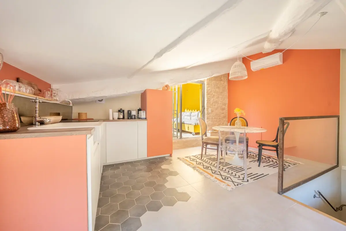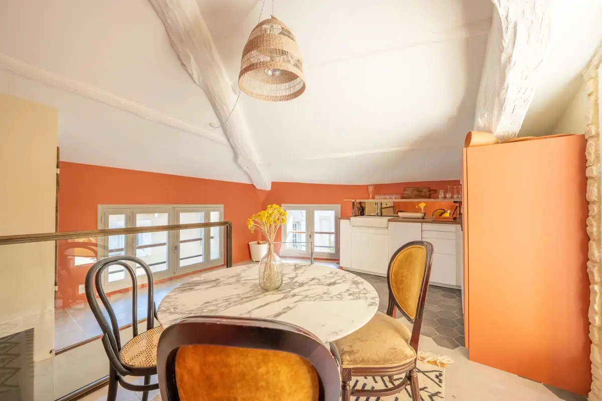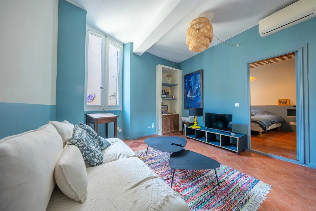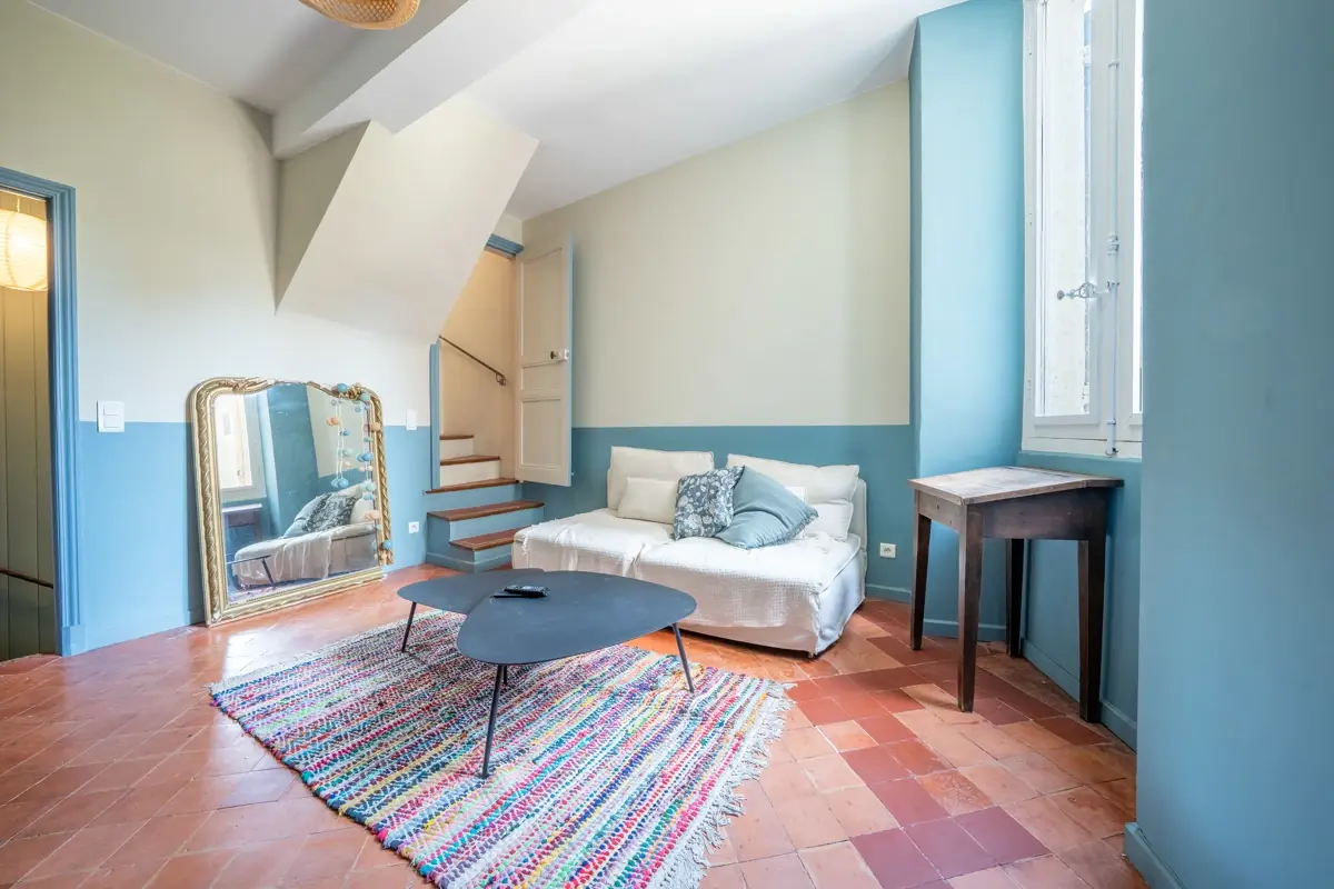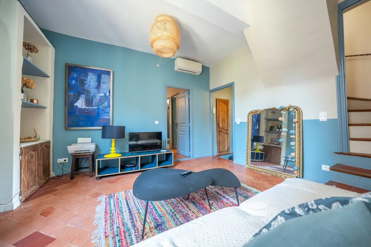 🛋️ Description intérieure : Au 1er étage d’un immeuble ancien datant de 1650 en très bon état général, ce bien de près de 70 m² (surface totale) dispose d'un salon , au 2éme étage, une pièce de vie lumineuse avec cuisine ouverte entièrement équipée, et des finitions soignées, avec accès direct sur une belle terrasse plein sud à l'abri des regards. Double vitrage sur l’ensemble des ouvertures et climatisation réversible garantissent un confort optimal toute l’année. L’appartement est vendu meublé, avec un aménagement actuel ne nécessitant aucun travaux.