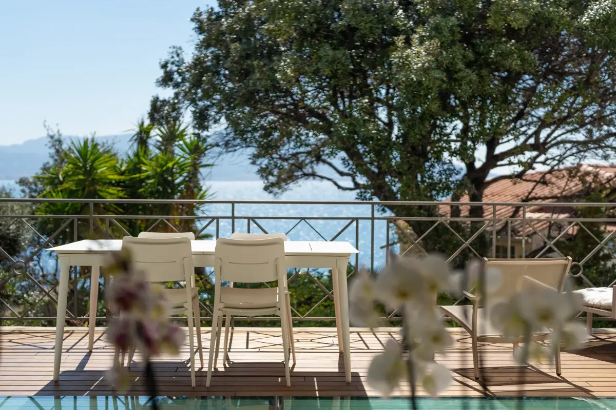 Le jardin arboré inclut un accès privé à la mer. Une terrasse offre une vue panoramique sur la mer et les îles.