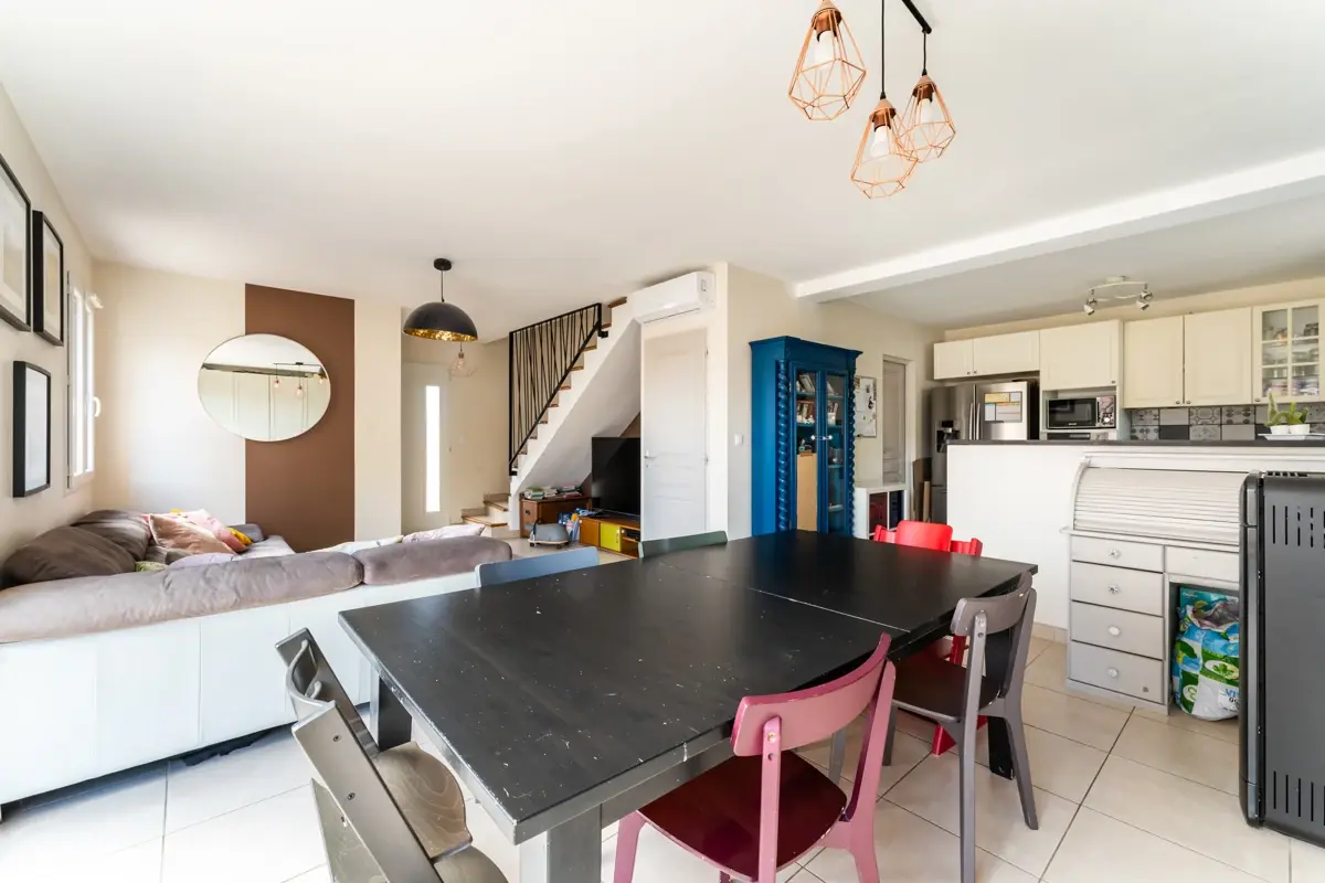 Construite en 2017, cette maison de 100m² sur deux niveaux offre une pièce de vie spacieuse et lumineuse avec cuisine ouverte, trois chambres, un bureau, une salle d'eau avec WC séparé, et un extérieur avec terrasse en bois sur un terrain de 350m² piscinable. Prestations modernes : climatisation réversible, poêle à bois, deux places de parking, et garage.