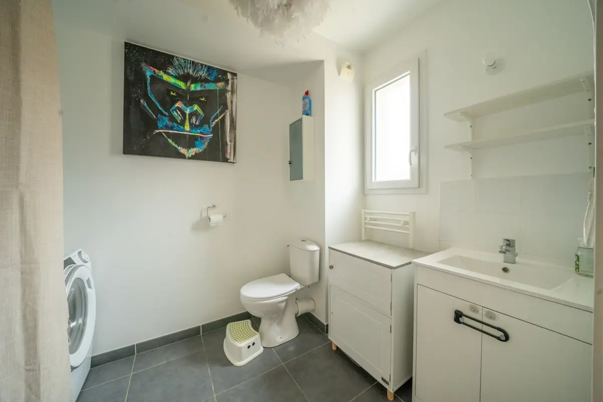 Au rez-de-chaussée, l’entrée dessert une salle d’eau type buanderie avec WC, un placard sous escalier pratique pour le rangement, ainsi qu’une cuisine aménagée et équipée ouverte sur un séjour lumineux. Cette pièce de vie s’ouvre directement sur la terrasse et le jardin, prolongeant agréablement l’espace de vie vers l’extérieur.