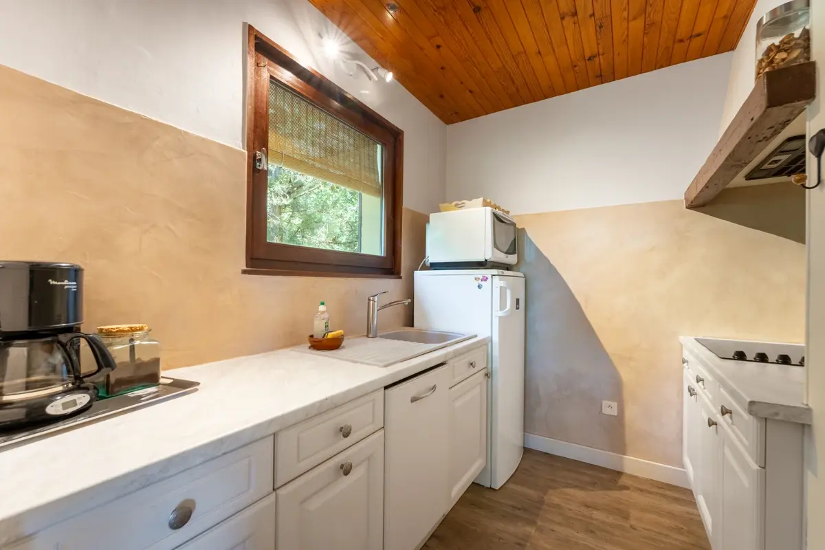 Ce chalet de 120 m² (69 m² loi carrez) propose un salon lumineux avec cheminée donnant sur une terrasse orientée Sud et à une cuisine équipée.