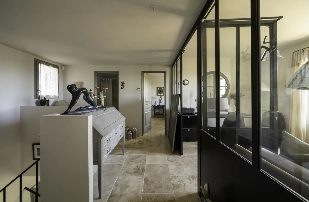 L’étage propose une suite parentale avec salle d'eau wc, une chambre d'amis baignée de lumière qui partage une salle de bain wc avec une troisième chambre actuellement utilisée comme bureau.