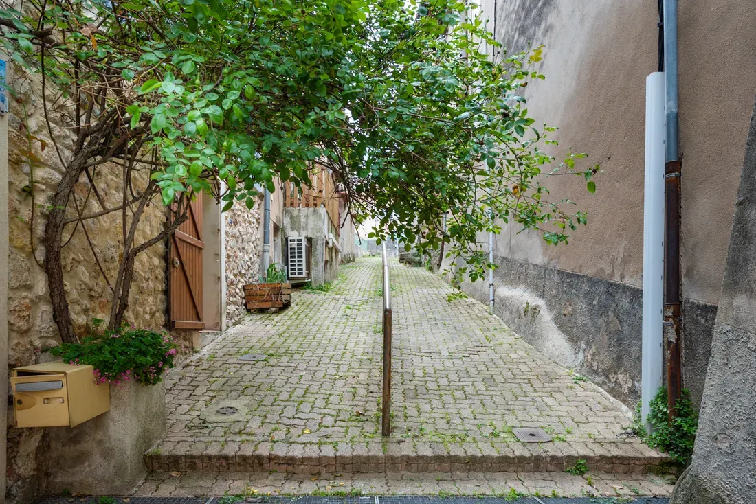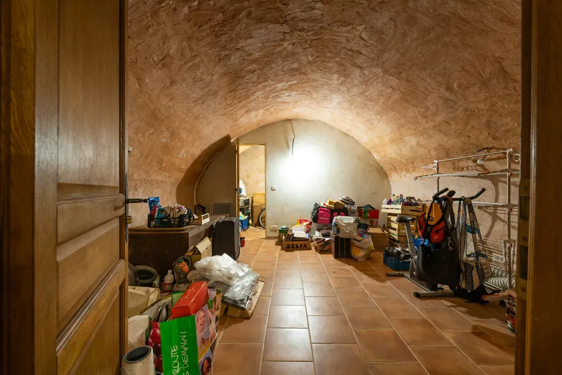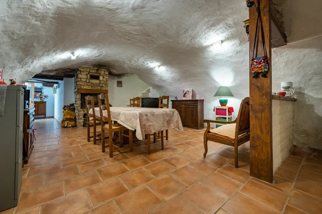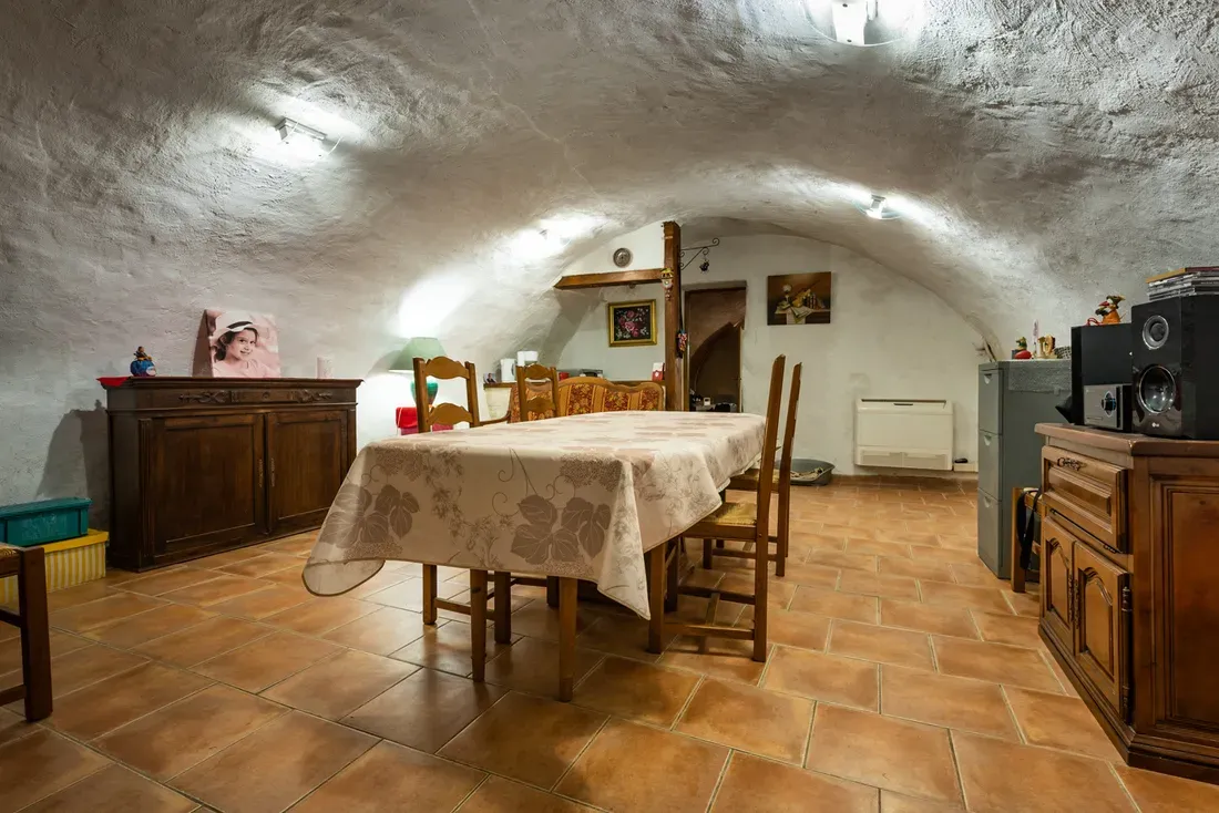 Élevée de 2 étages, dans une rue piétonne, cette maison de village se compose au RDC d’une entrée s’ouvrant sur un bel espace de vie voûté de 20m2 environ avec sa cheminée (insert), puis suivi par 2 caves en enfilade dont une carrelée de 13m2.