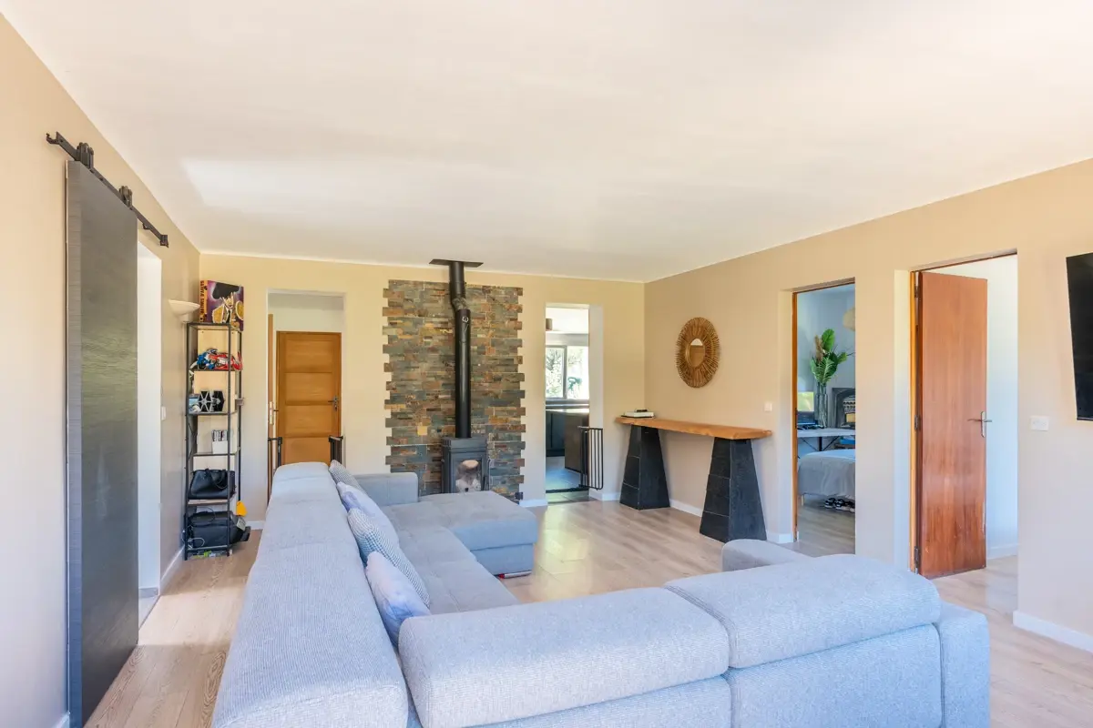 Séjour | 27.2 m2 | - | avec le poêle à bois et 2 ouvertures sur cuisine/salle à manger |