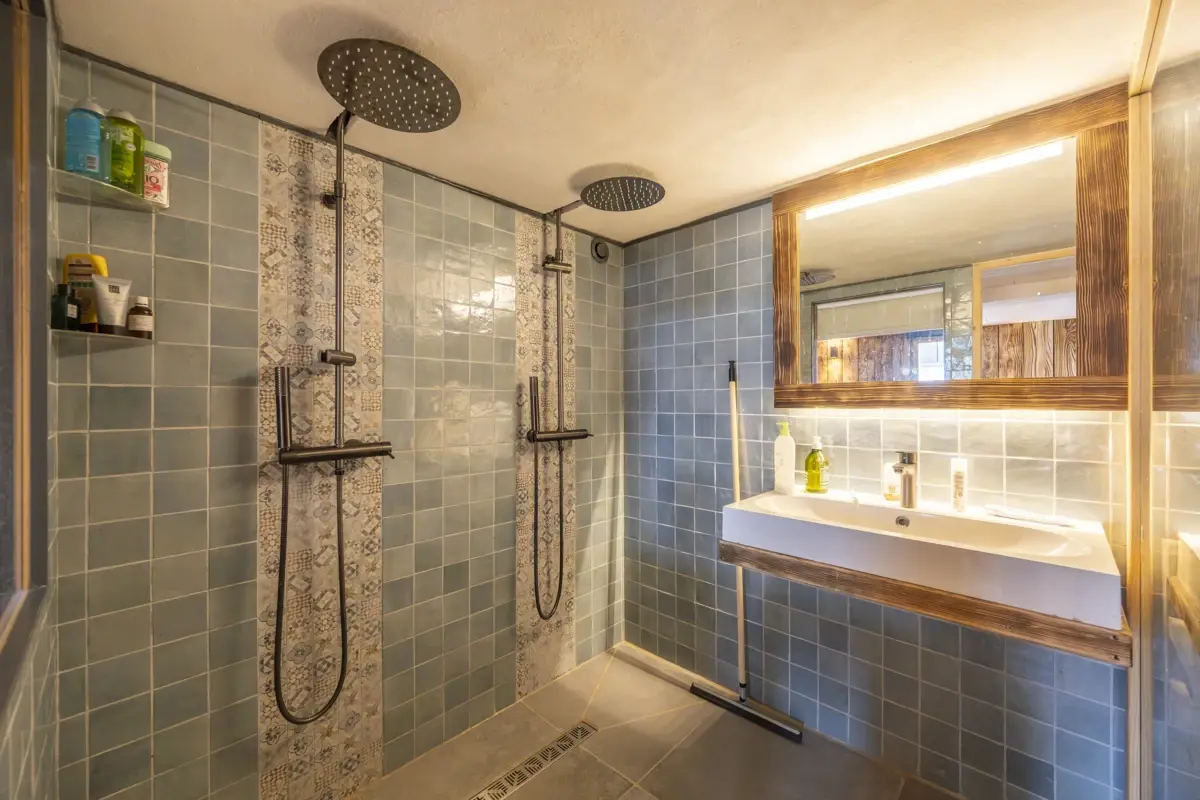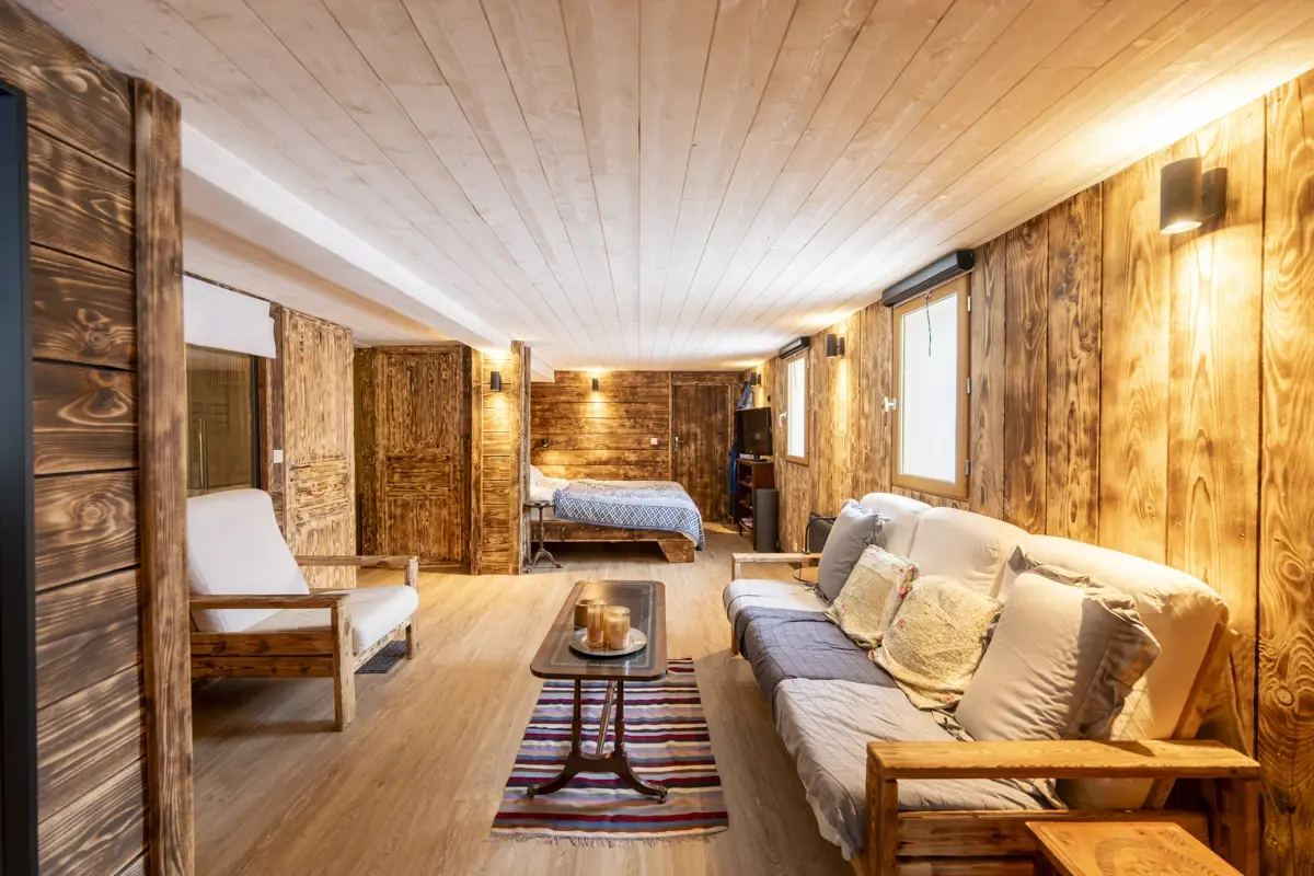 L'appartement du Rez de chaussé, entièrement rénové dans un style de chalet, propose un hall d'entrée, une cuisine, un salon avec un lit double, un coin montagne, un dressing, une salle de bain avec une double douche, un sauna et une chaufferie.