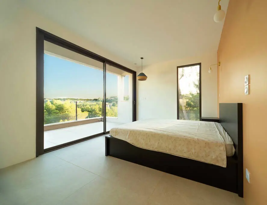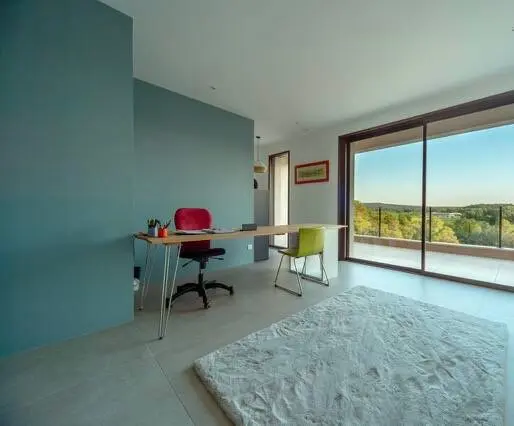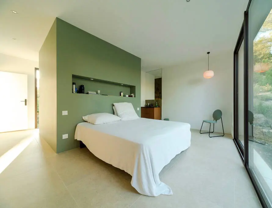 À l'étage, l'espace nuit propose trois grandes chambres avec baies à galandage de plain pied sur une terrasse avec chacune sa salle d'eau . Vue panoramique pour les 2 chambres au sud et vue traversante Est-Ouest sur le maquis , offrant un cadre intime, pour la suite parentale .