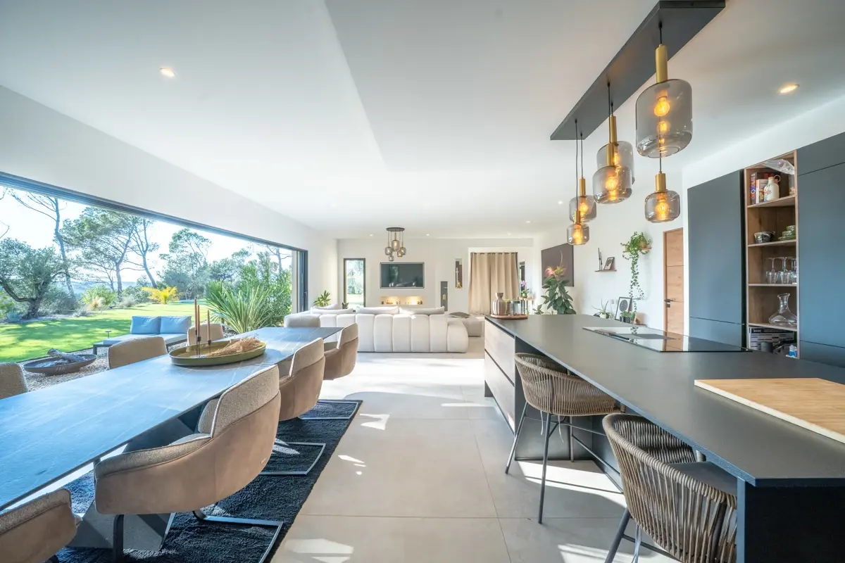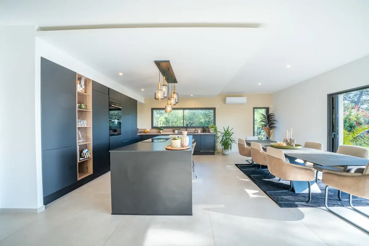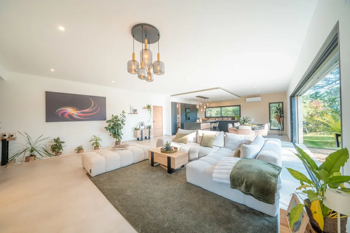 🏠 Description intérieure : La villa s’ouvre sur un hall d’entrée avec vestiaire et dévoile un vaste espace de vie de 83 m² baigné de lumière, grâce à une baie à galandage de 6 mètres offrant une vue saisissante sur le jardin, les terrasses et faisant face au coucher de soleil. La cuisine, parfaitement équipée, intègre un cellier/lingerie indépendant. La maison est dotée d’un système de pompe à chaleur réversible.