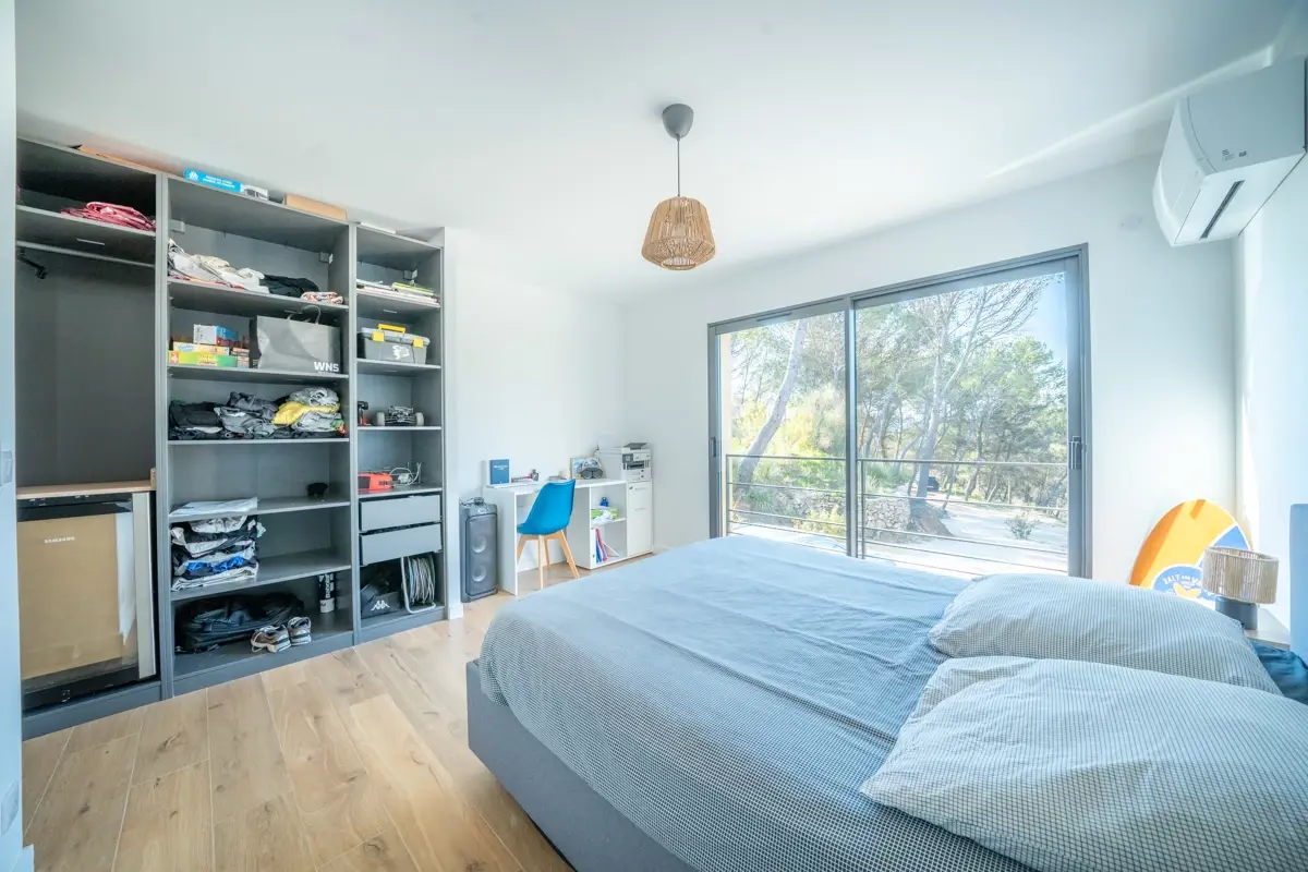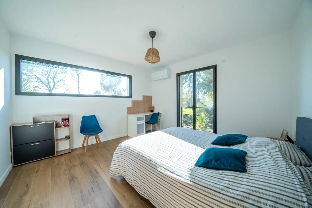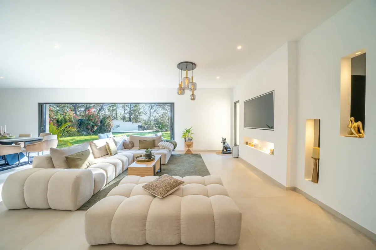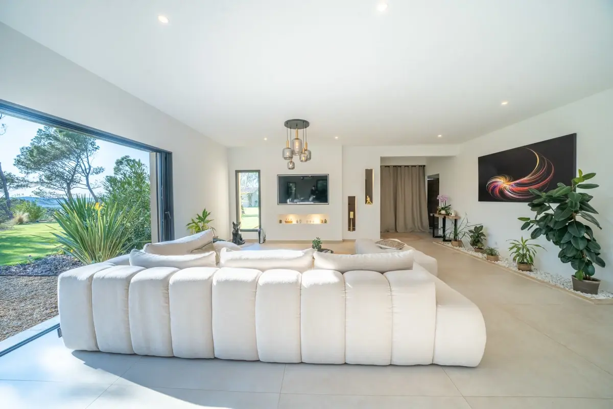 🏠 Description intérieure : La villa s’ouvre sur un hall d’entrée avec vestiaire et dévoile un vaste espace de vie de 83 m² baigné de lumière, grâce à une baie à galandage de 6 mètres offrant une vue saisissante sur le jardin, les terrasses et faisant face au coucher de soleil. La cuisine, parfaitement équipée, intègre un cellier/lingerie indépendant. La maison est dotée d’un système de pompe à chaleur réversible.