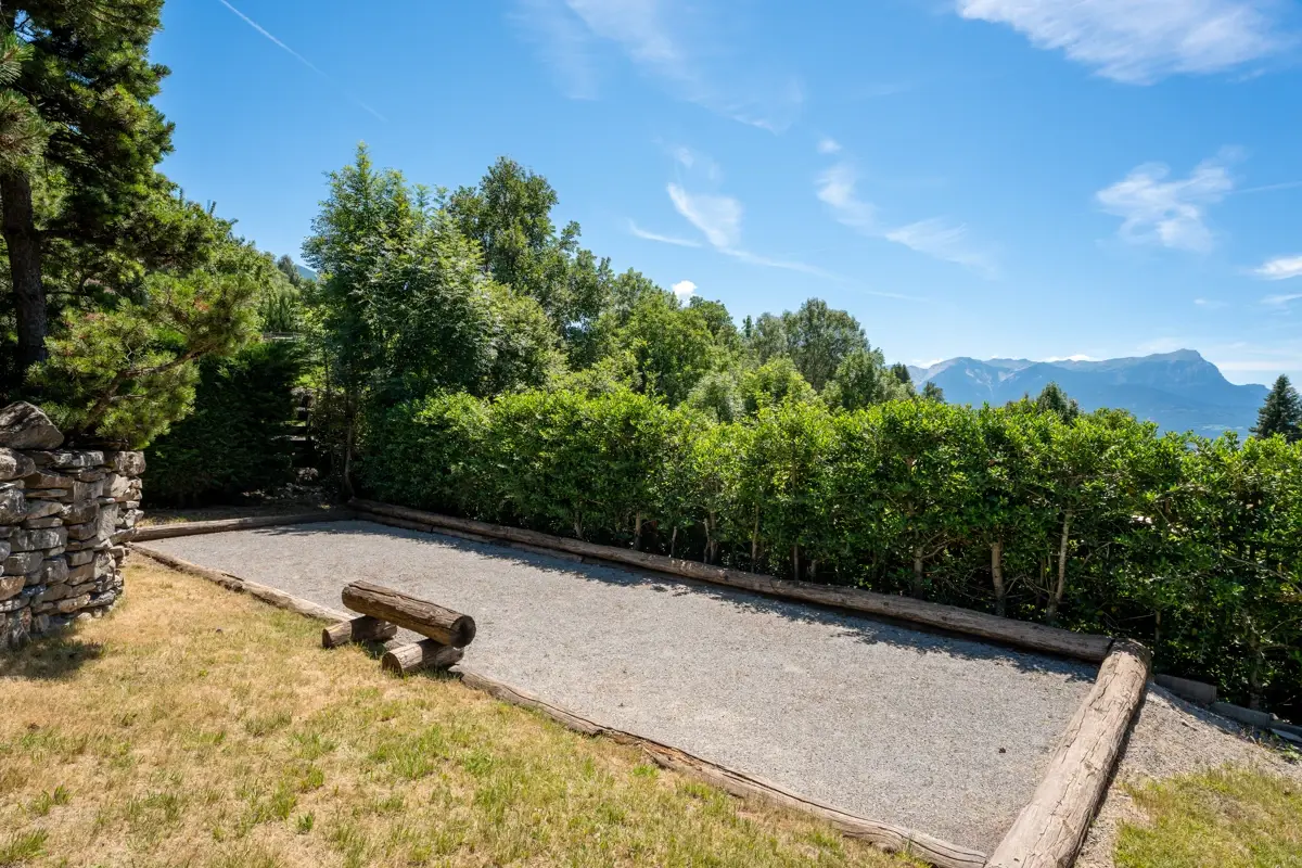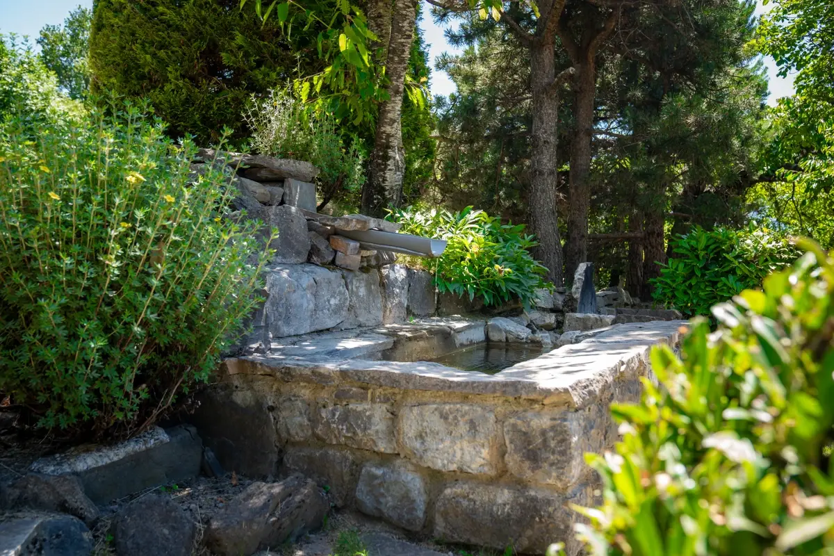 Le terrain plat et arboré est équipé d'une fontaine, d'un terrain de pétanque, d'un barbecue et de différents niveaux pour profiter au maximum de l'ensoleillement.