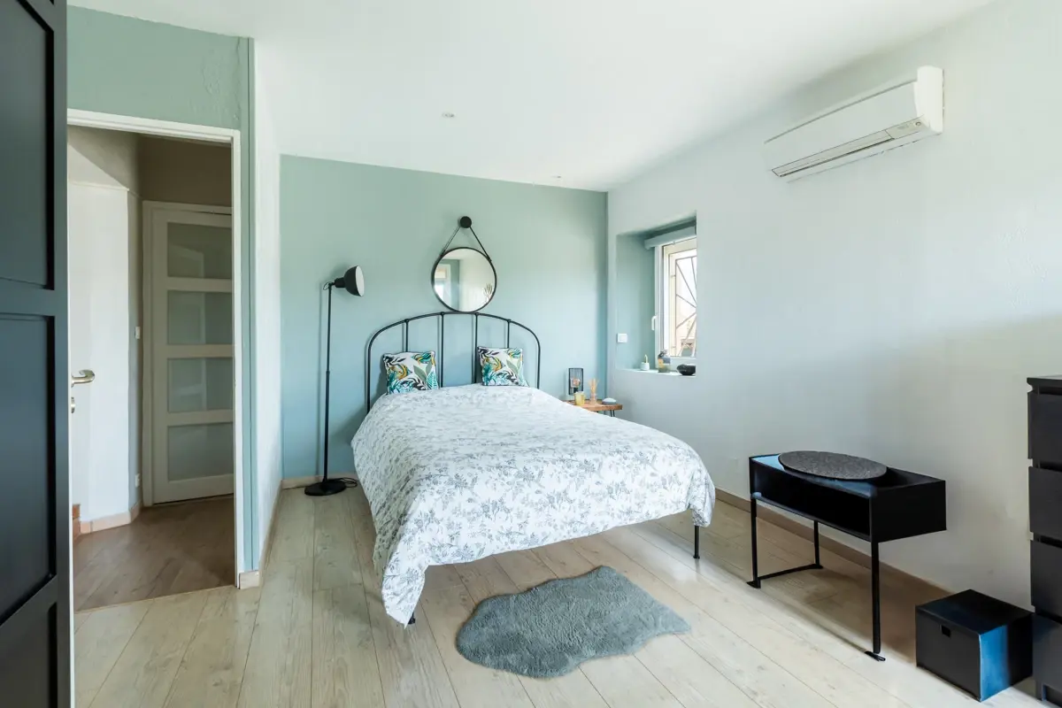 Profitez d'une vaste terrasse en travertin, d'un gazon synthétique, et d'une piscine traditionnelle avec volet roulant électrique, garantissant une intimité absolue.