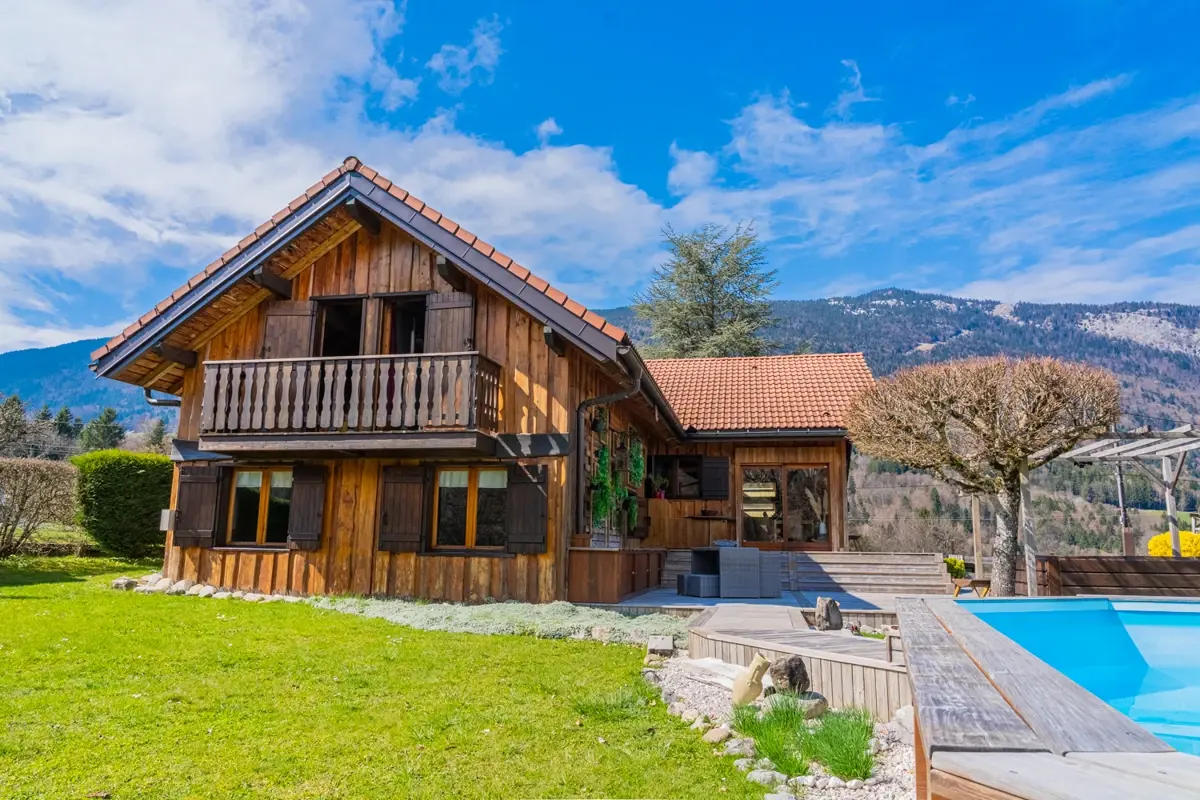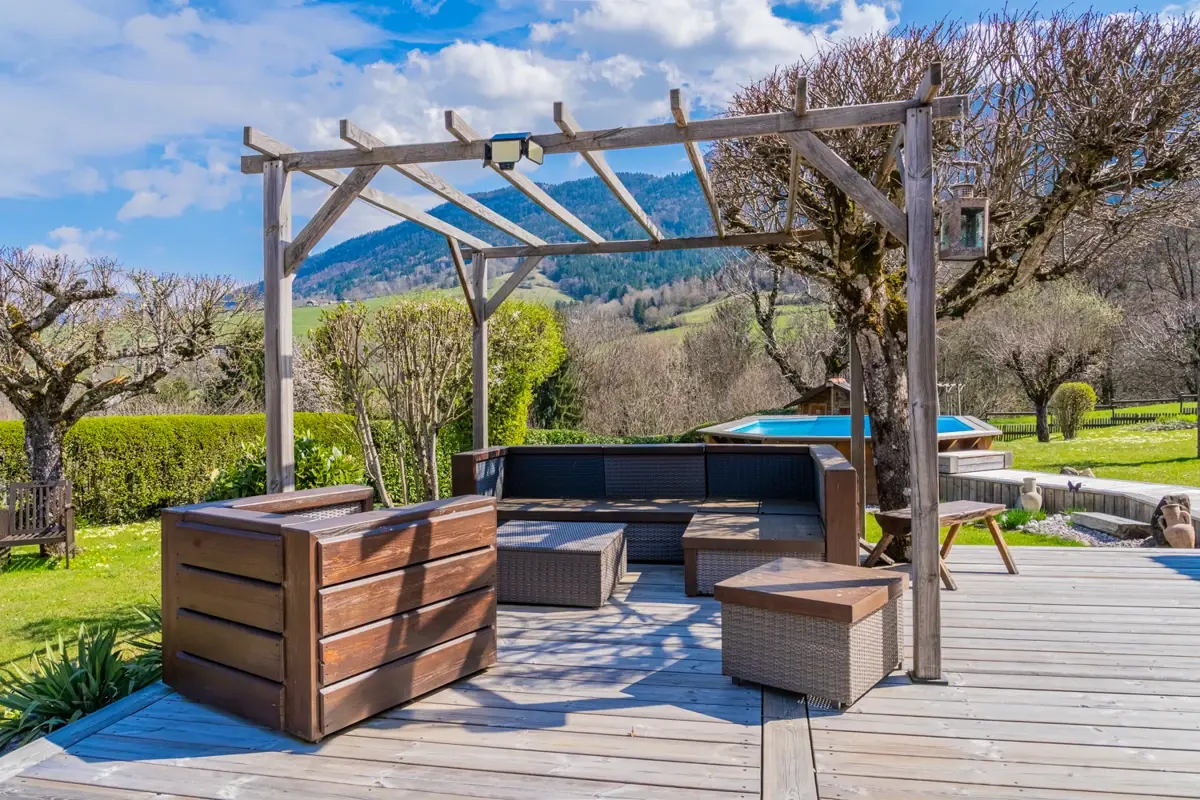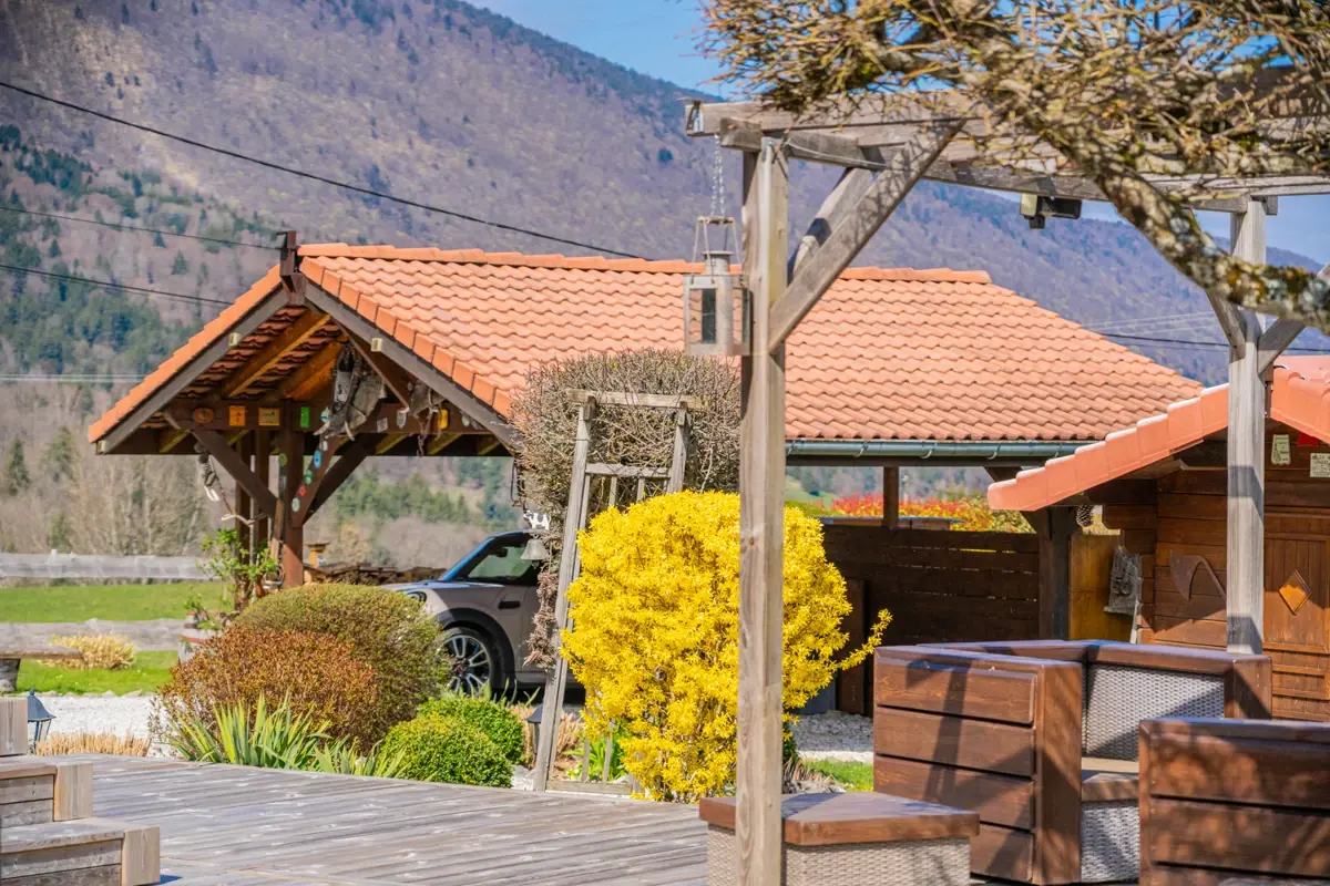 Grand jardin arboré impeccablement tenu et varié de près de 1600 m² (tilleuls, cèdres, fruitiers) avec terrasse sud de 20 m², terrasse est de 60m2, balcon de 8 m² au premier étage avec vue sur les montagnes et espace piscine (nage à contre‑courant).