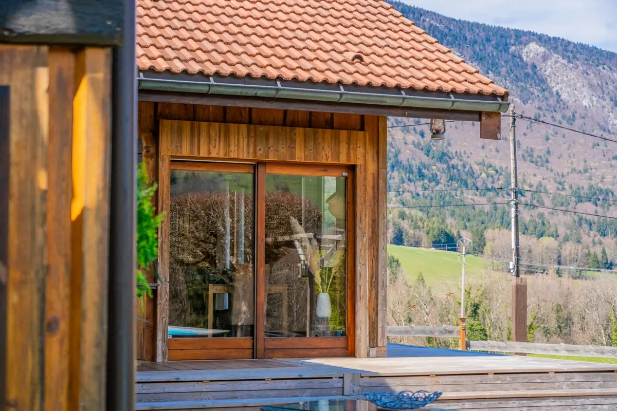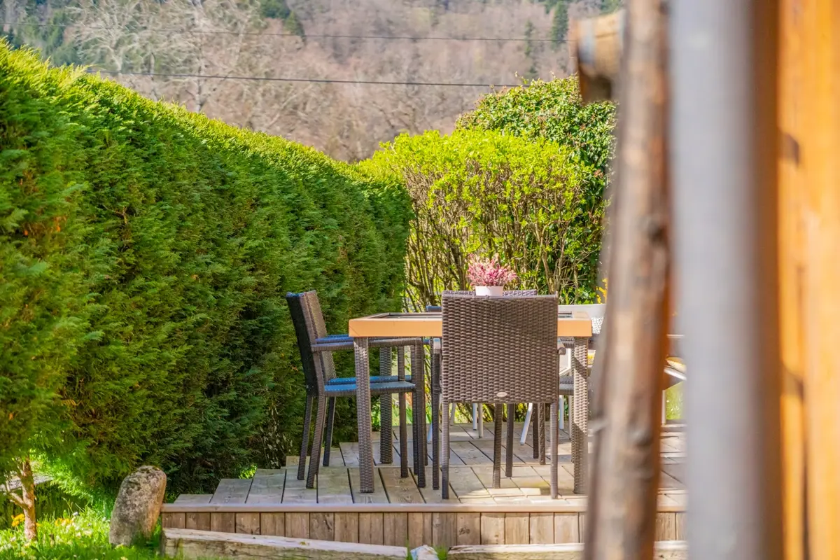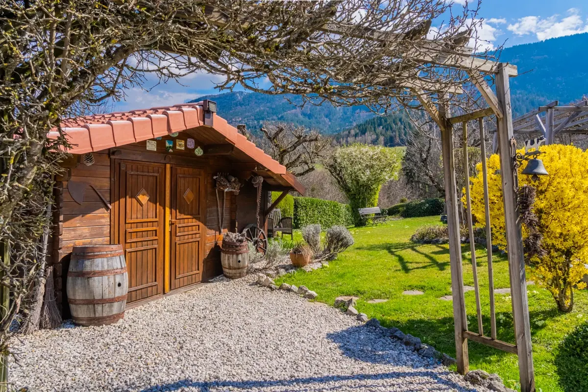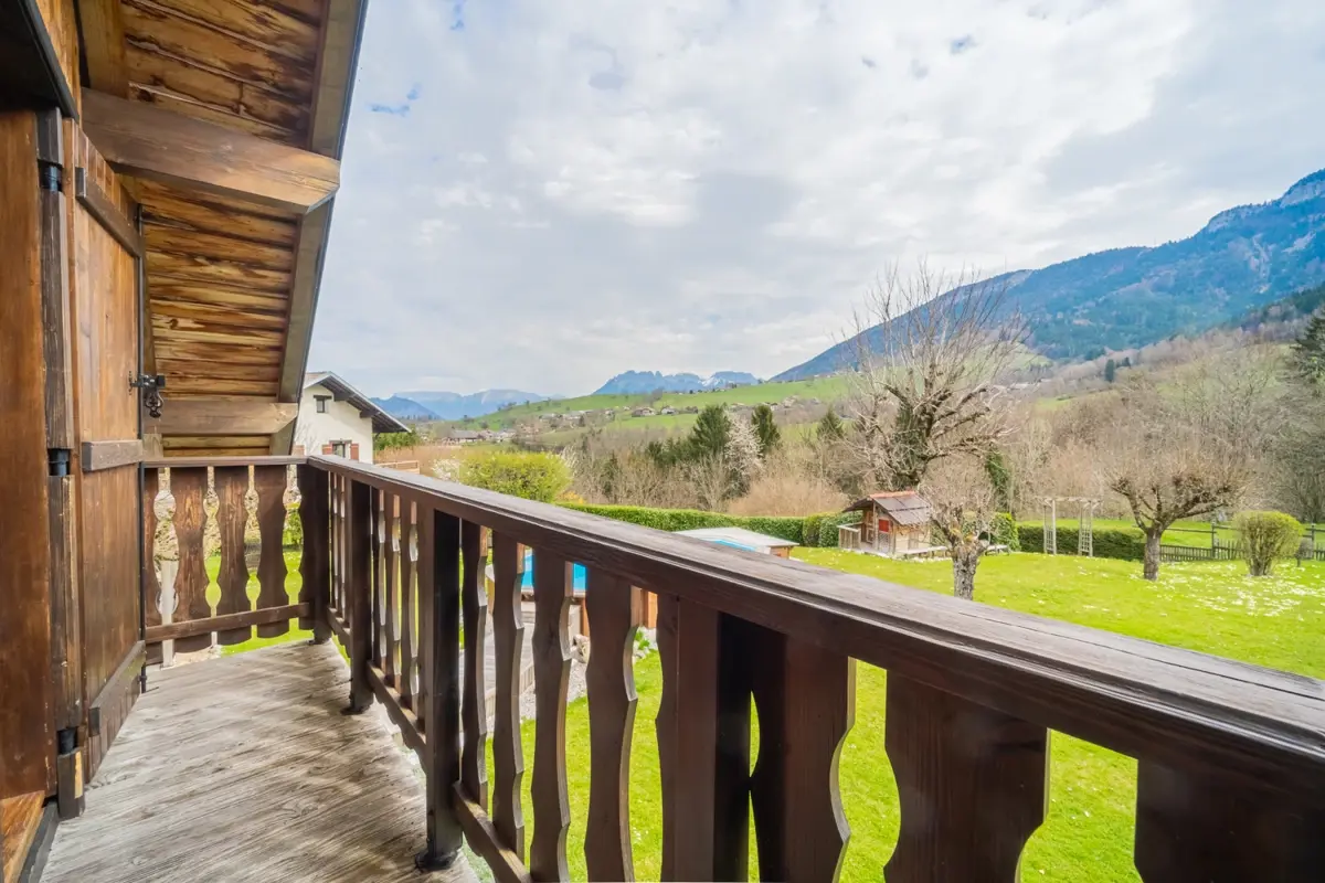 Grand jardin arboré impeccablement tenu et varié de près de 1600 m² (tilleuls, cèdres, fruitiers) avec terrasse sud de 20 m², terrasse est de 60m2, balcon de 8 m² au premier étage avec vue sur les montagnes et espace piscine (nage à contre‑courant).